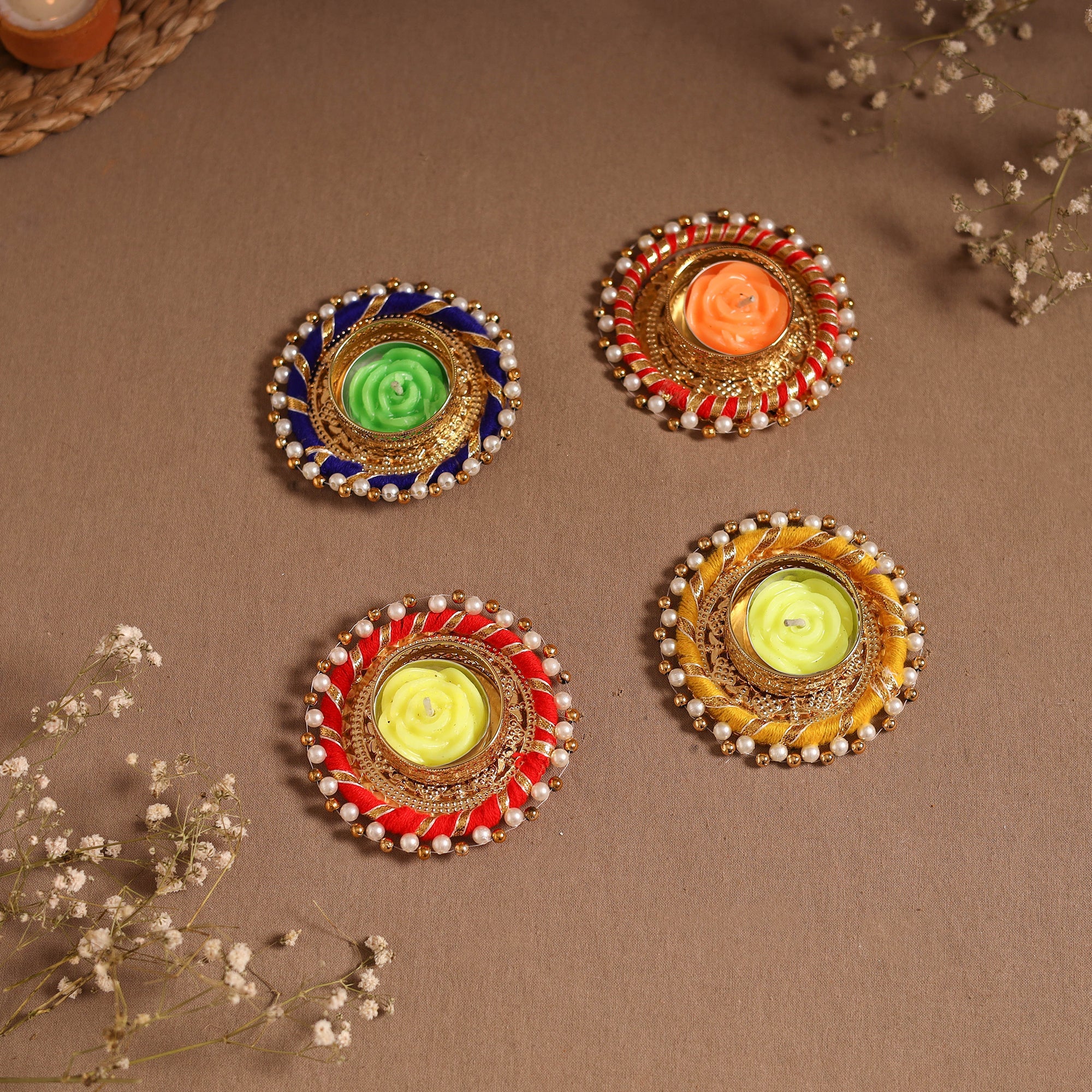 Brighten your home with this handmade tealight candle holder, designed with intricate detailing that reflects India’s rich artistry. Each piece showcases vibrant colors, unique decorative work, and comes with a rose-shaped candle, making it perfect for festivals, gatherings, or everyday decor. A beautiful blend of tradition and elegance, this holder adds warmth, charm, and a festive glow to any space.