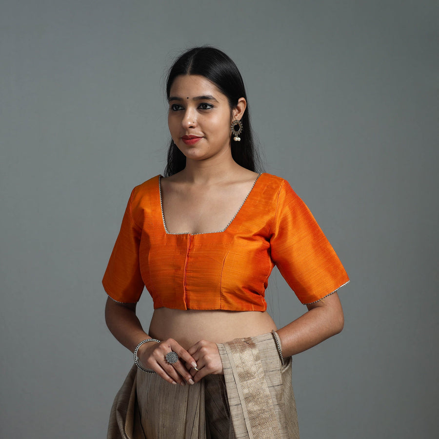 This gota patti orange slub silk plain blouse with features secure hook lock. It is lightweight, easy to wear and has a beautiful lustre. it pairs beautifully with sarees or lehengas, making it a perfect choice for festive occasions or formal gatherings.