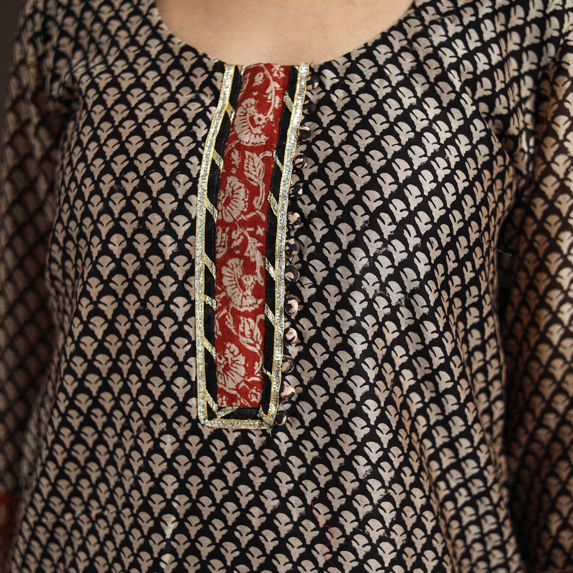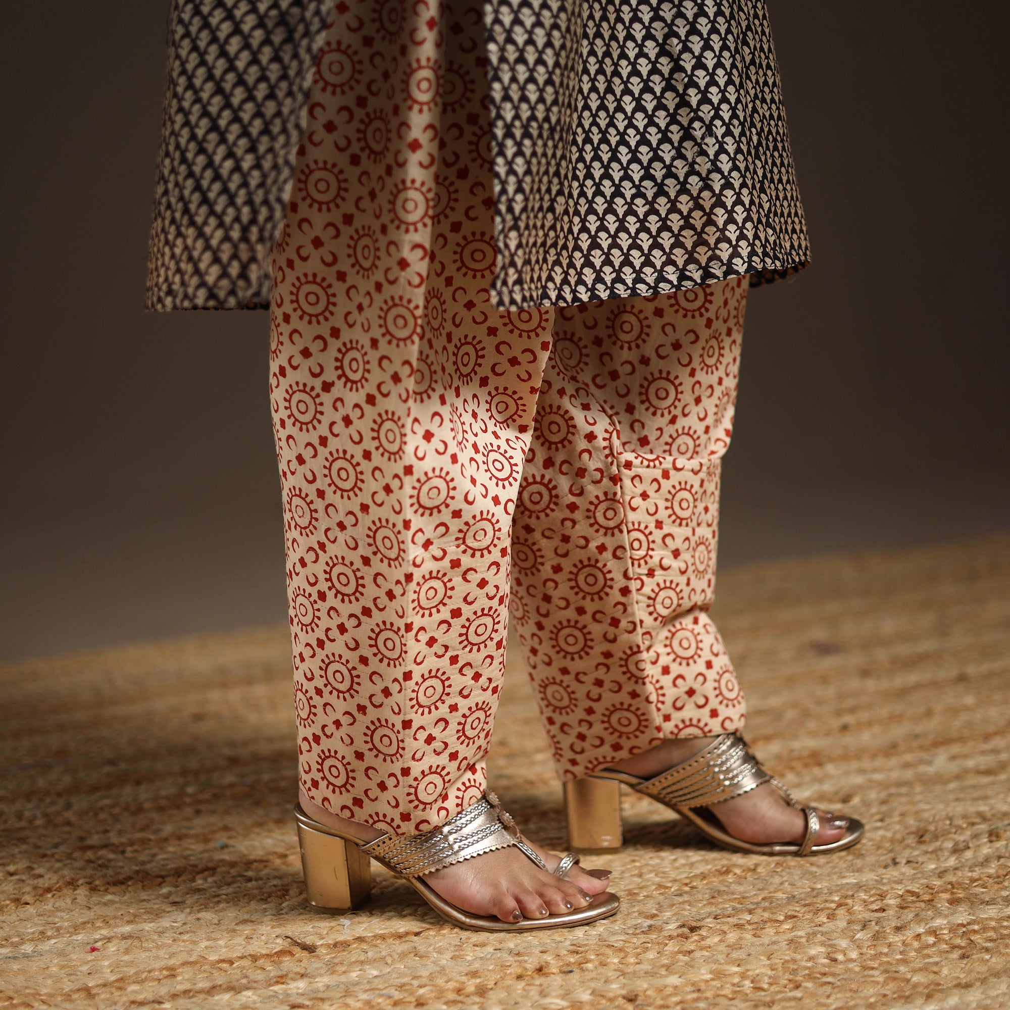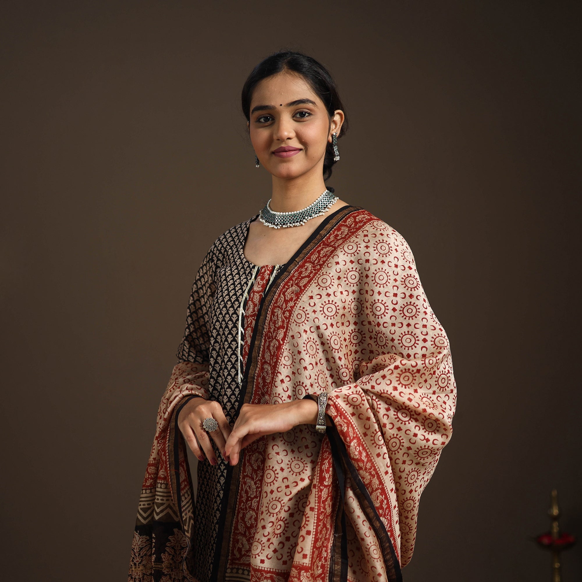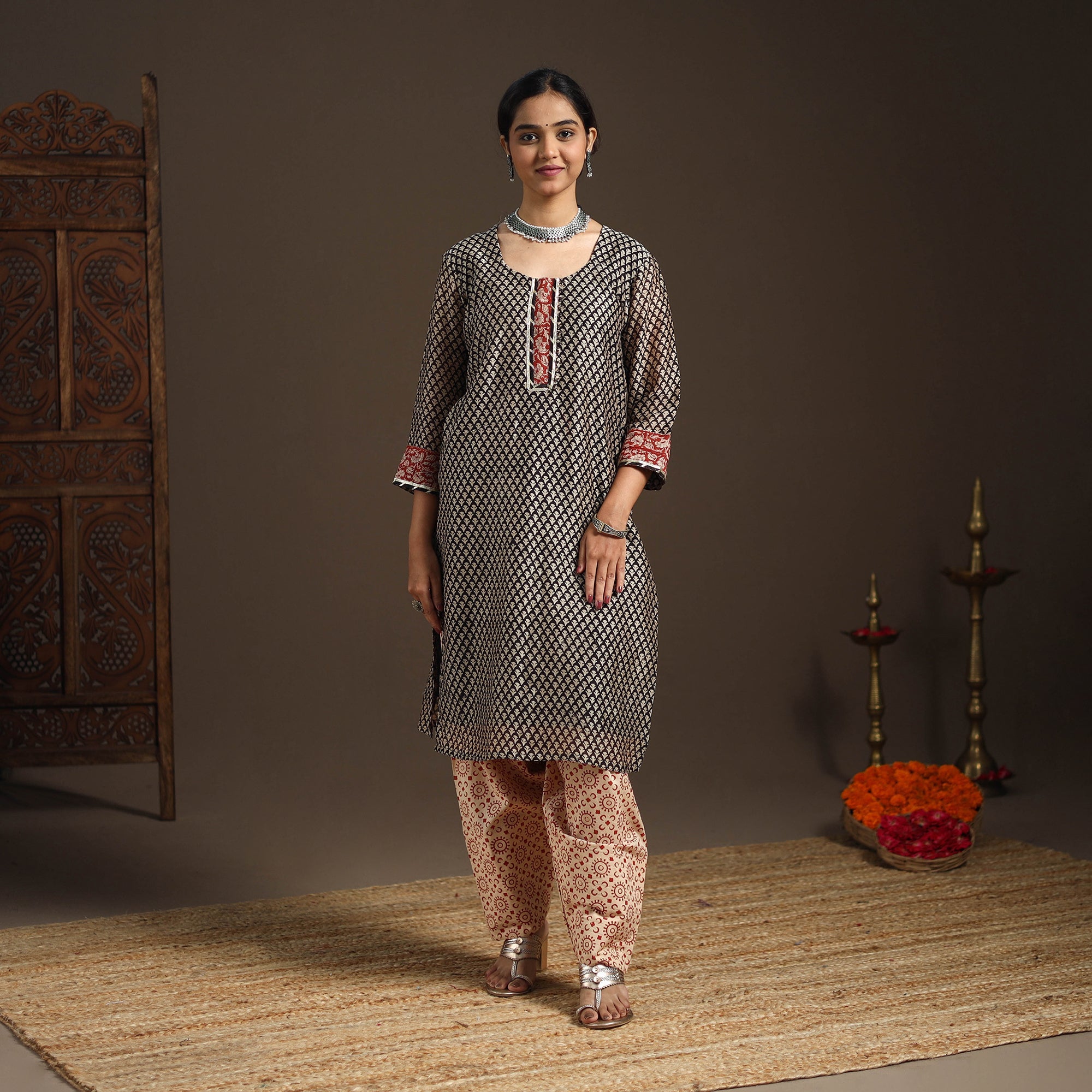 This black bagru block print gota work kurta set features a chanderi silk-cotton straight kurta with a side pocket, a cotton salwar, and a graceful dupatta. The set blends ethnic charm with everyday ease, making it ideal for festive gatherings or casual day-outs. It perfectly captures the essence of tradition with a touch of modern comfort.