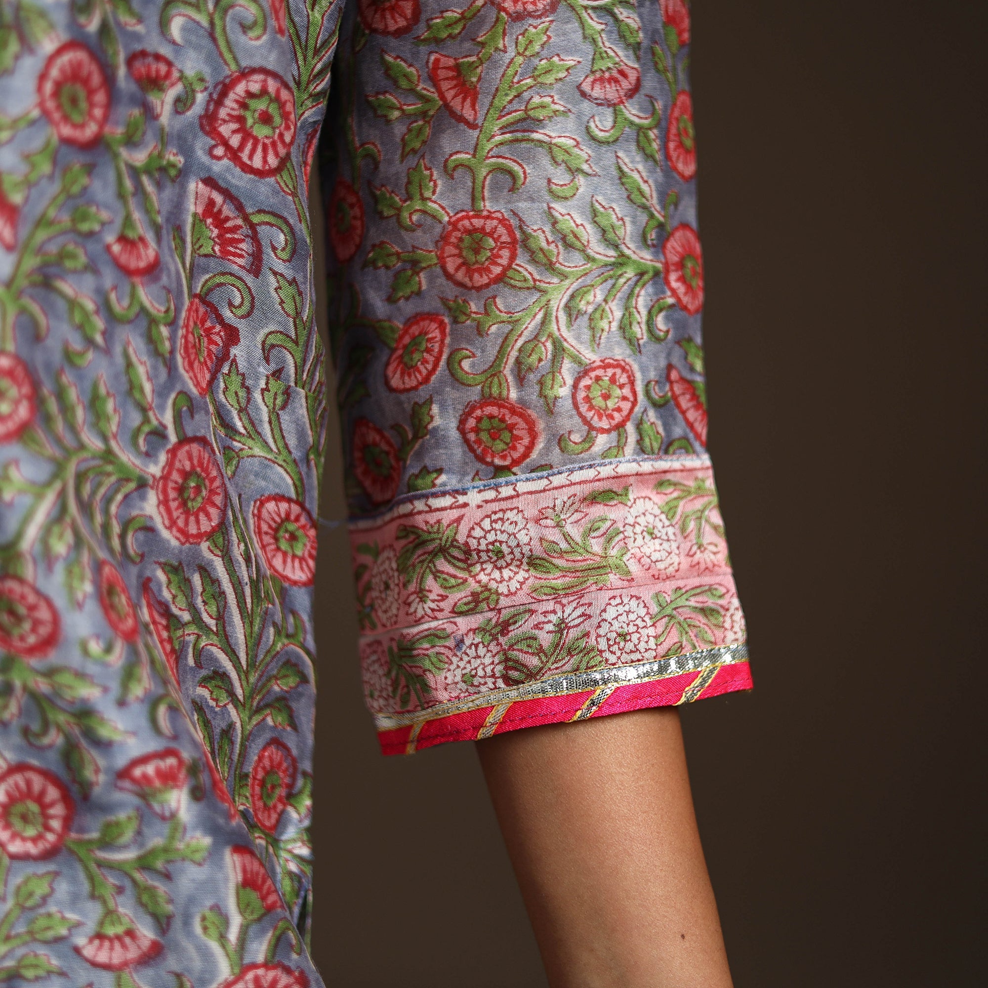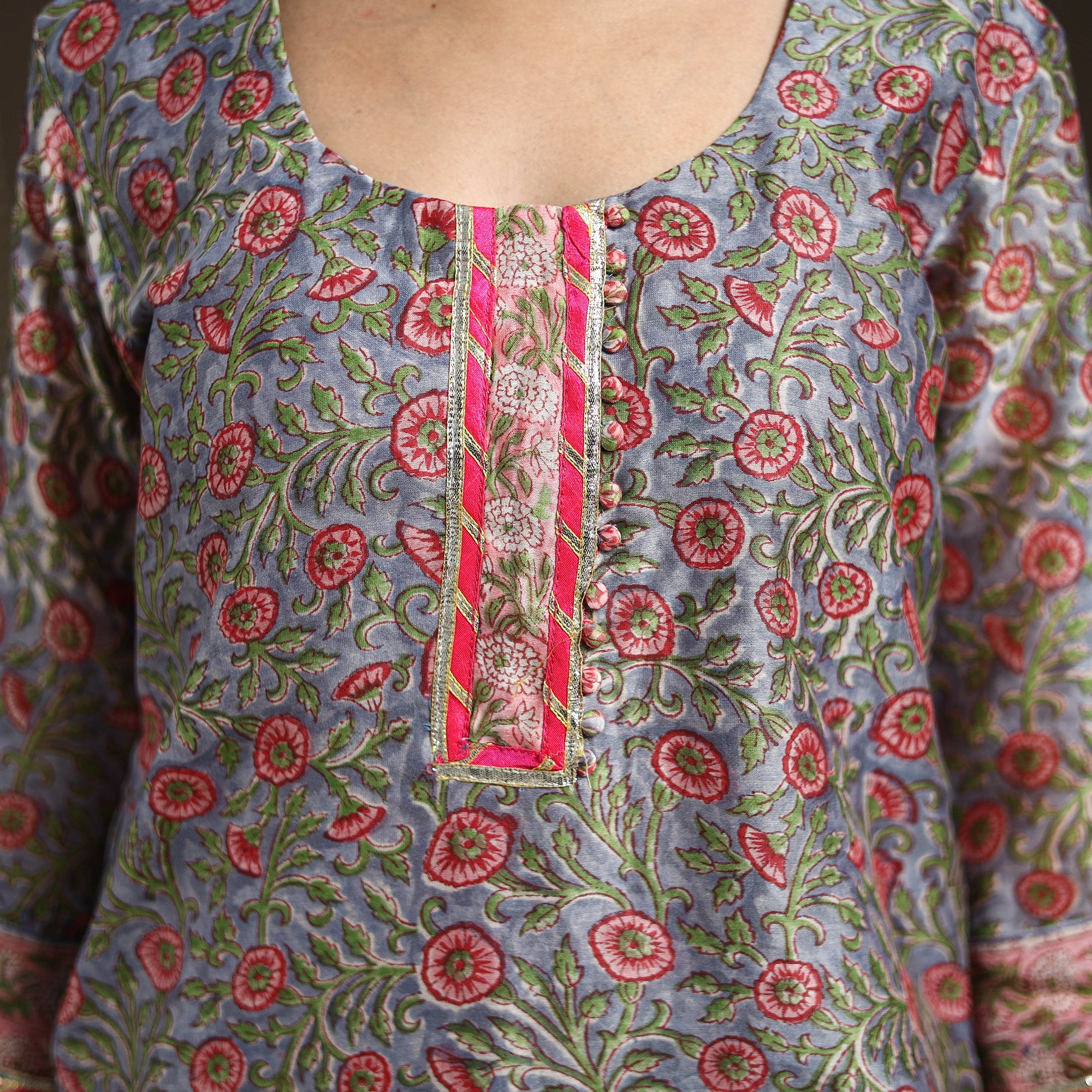 This blue sanganeri block print gota work kurta set features a chanderi silk-cotton straight kurta with a side pocket, a cotton salwar, and a graceful dupatta. The set blends ethnic charm with everyday ease, making it ideal for festive gatherings or casual day-outs. It perfectly captures the essence of tradition with a touch of modern comfort.