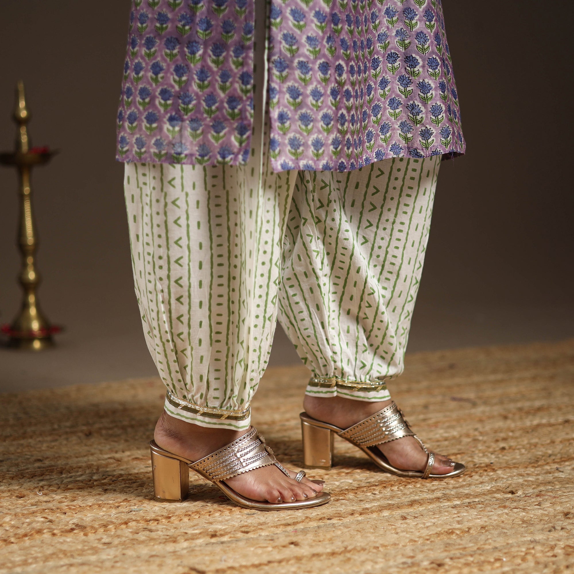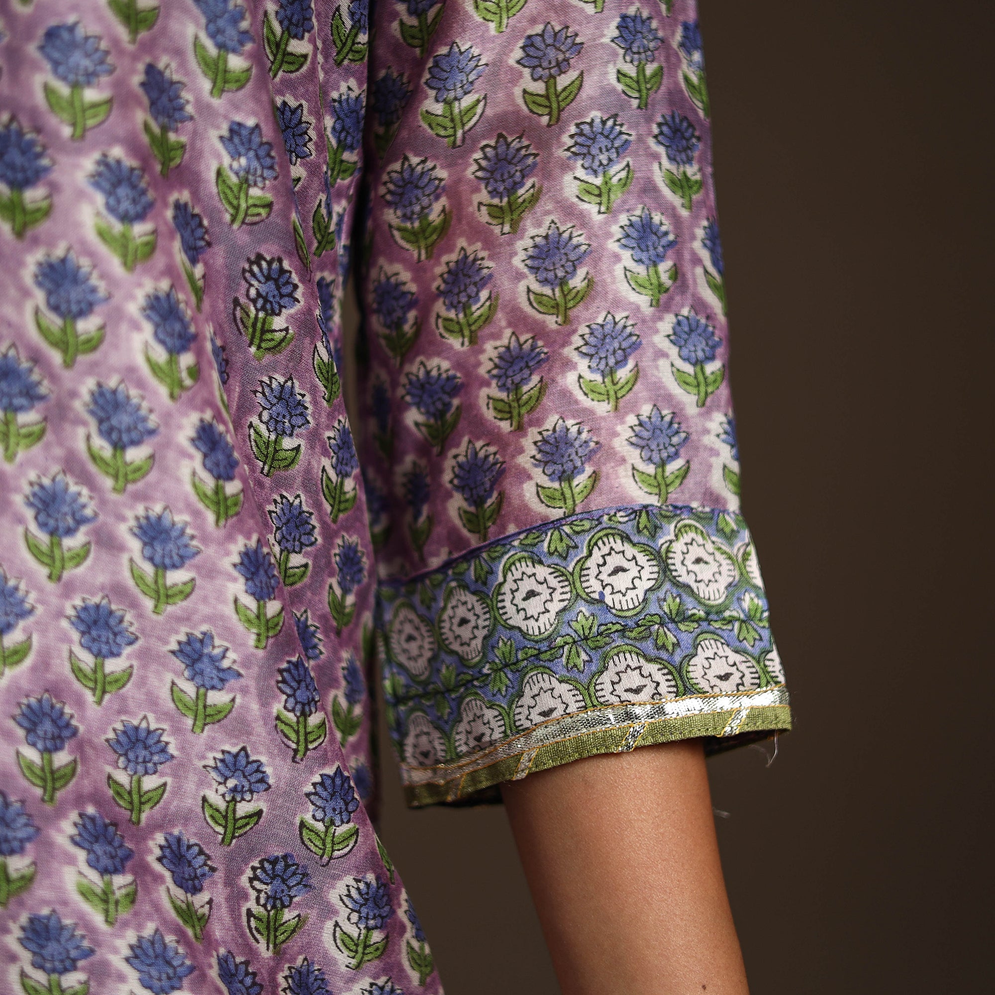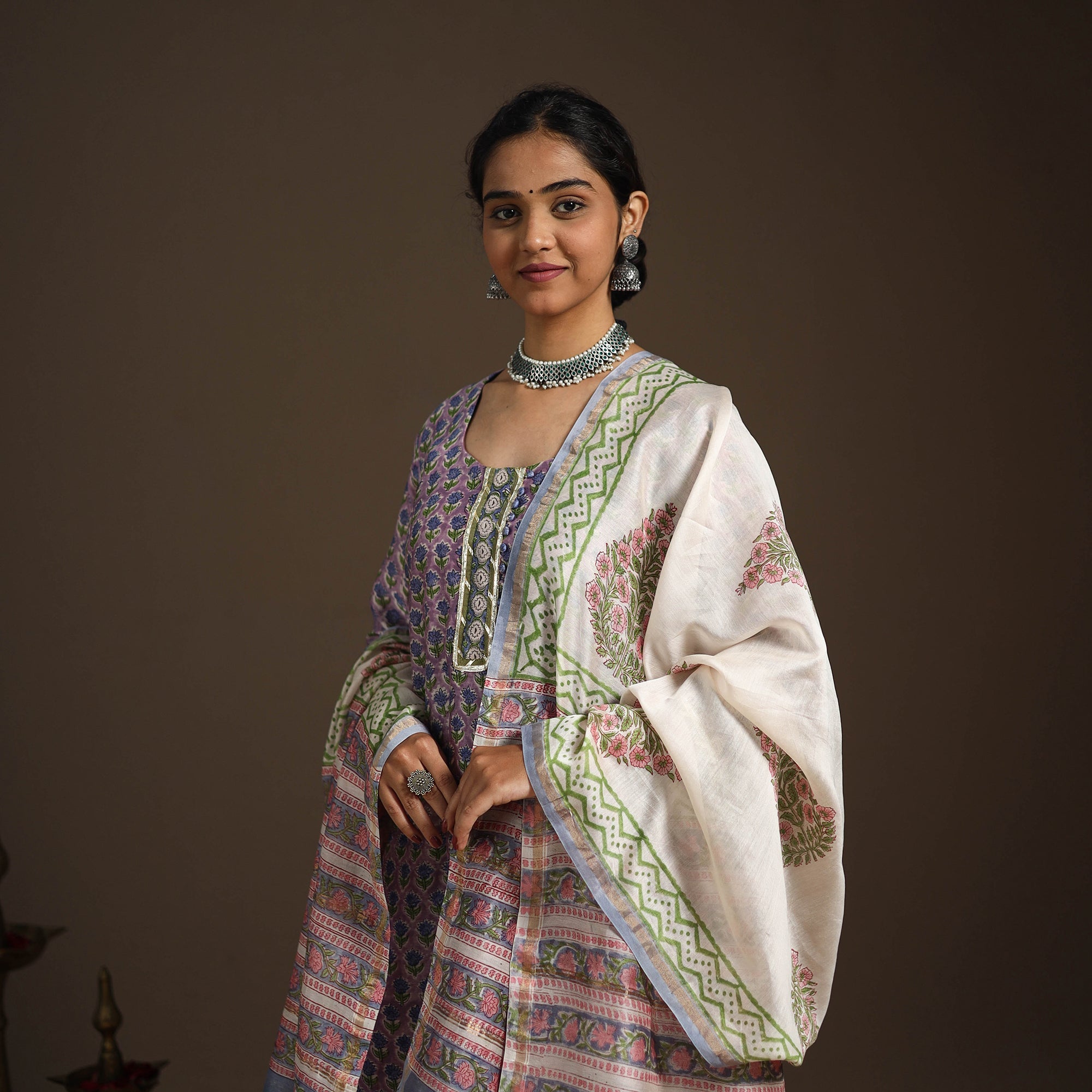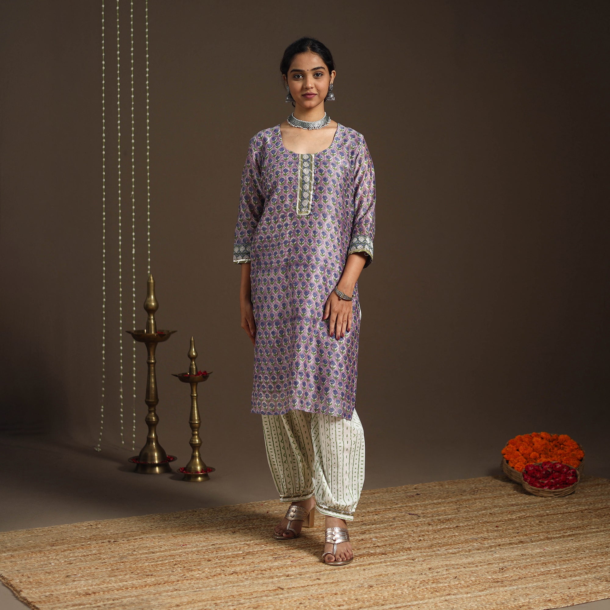This purple sanganeri block print gota work kurta set features a chanderi silk-cotton straight kurta with a side pocket, a cotton afghani salwar, and a graceful dupatta. The set blends ethnic charm with everyday ease, making it ideal for festive gatherings or casual day-outs. It perfectly captures the essence of tradition with a touch of modern comfort.