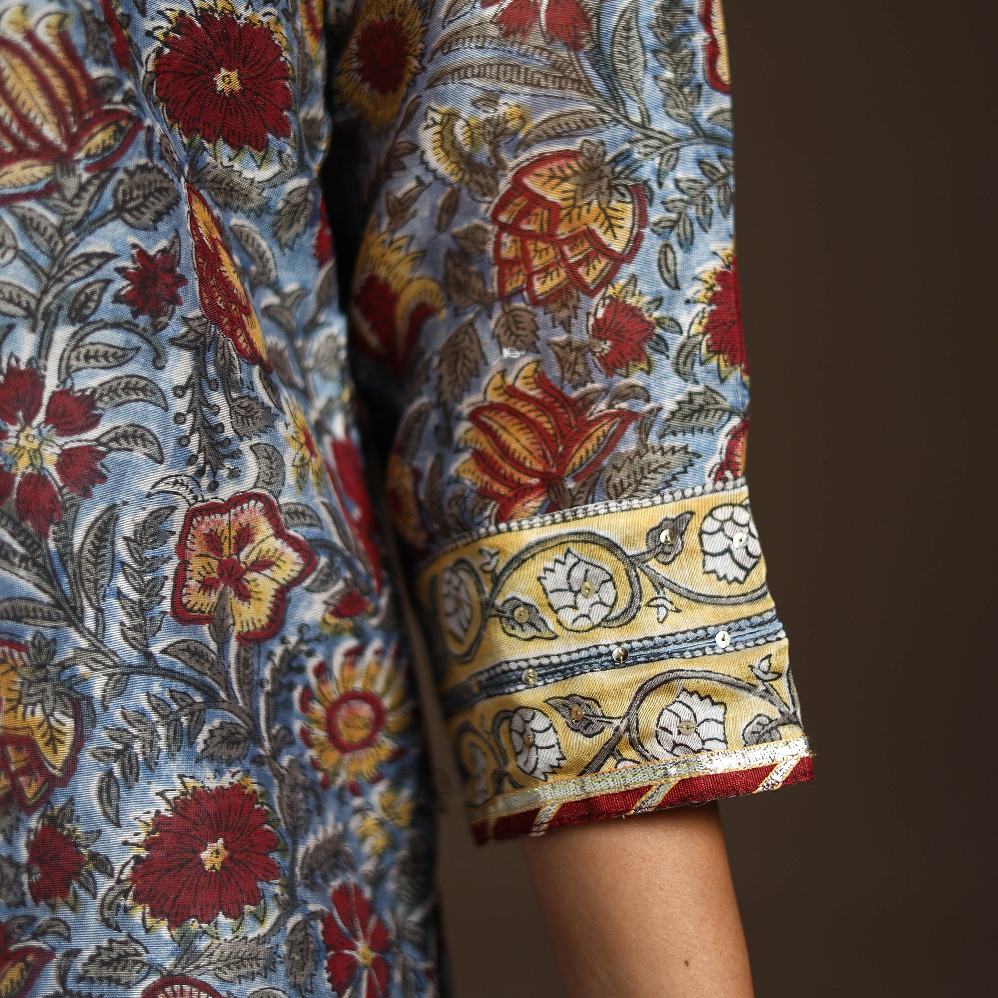 This blue sanganeri block print gota work kurta set features a chanderi silk-cotton straight kurta with a side pocket, a cotton salwar, and a graceful dupatta. The set blends ethnic charm with everyday ease, making it ideal for festive gatherings or casual day-outs. It perfectly captures the essence of tradition with a touch of modern comfort.