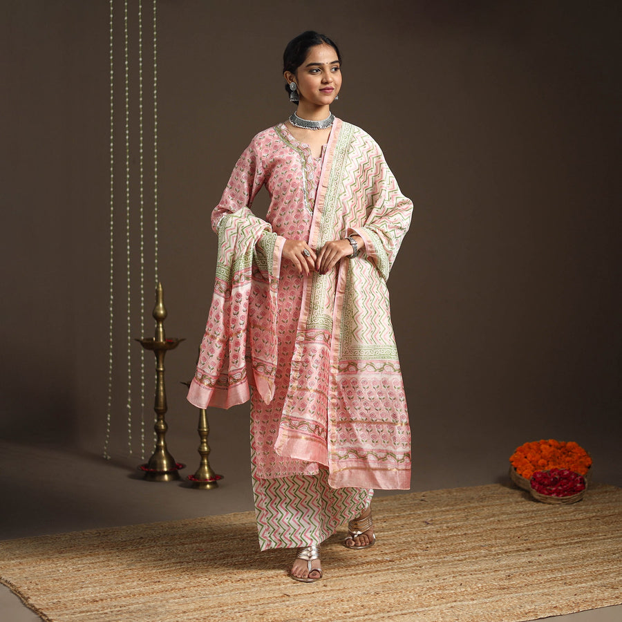 This pink sanganeri block print gota work kurta set includes a chanderi silk-cotton straight kurta with a side pocket, a cotton palazzo with pockets, and a graceful dupatta. The set combines traditional elegance with everyday ease, making it perfect for festive gatherings or casual outings. It beautifully reflects the charm of heritage while offering modern comfort.