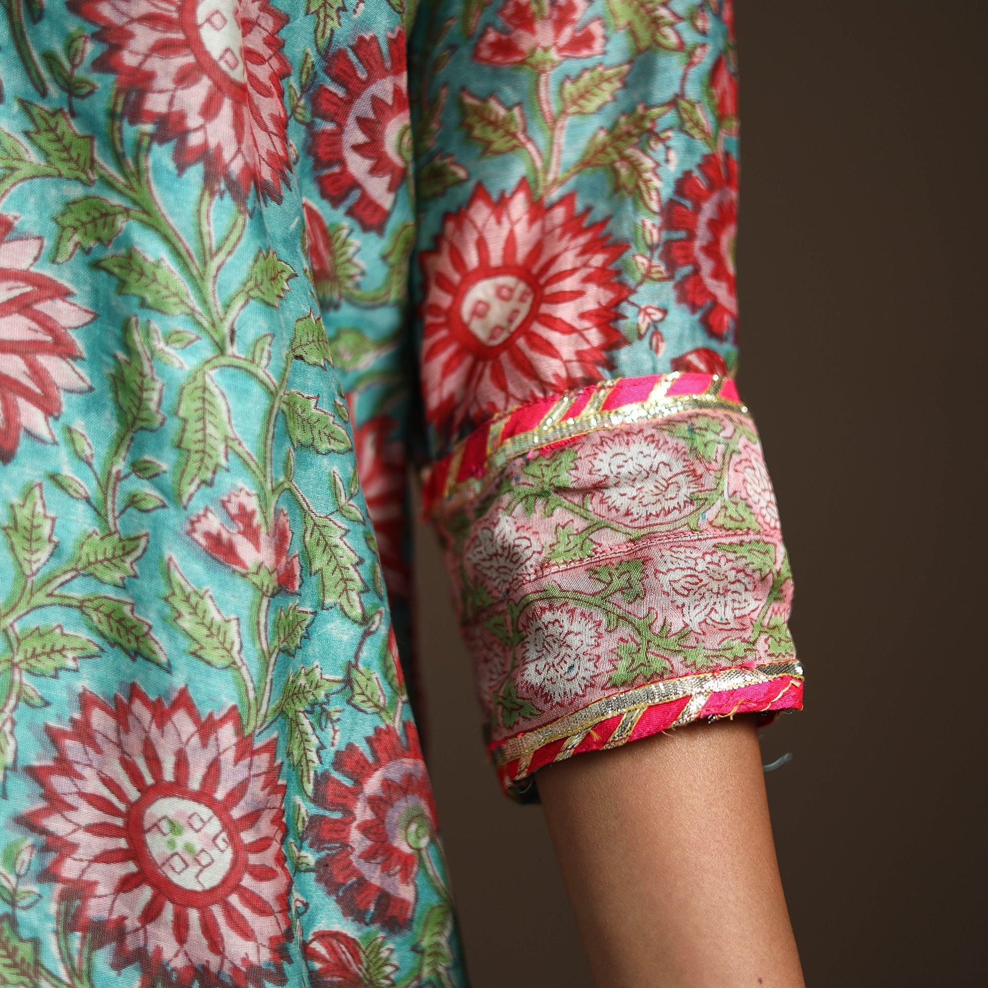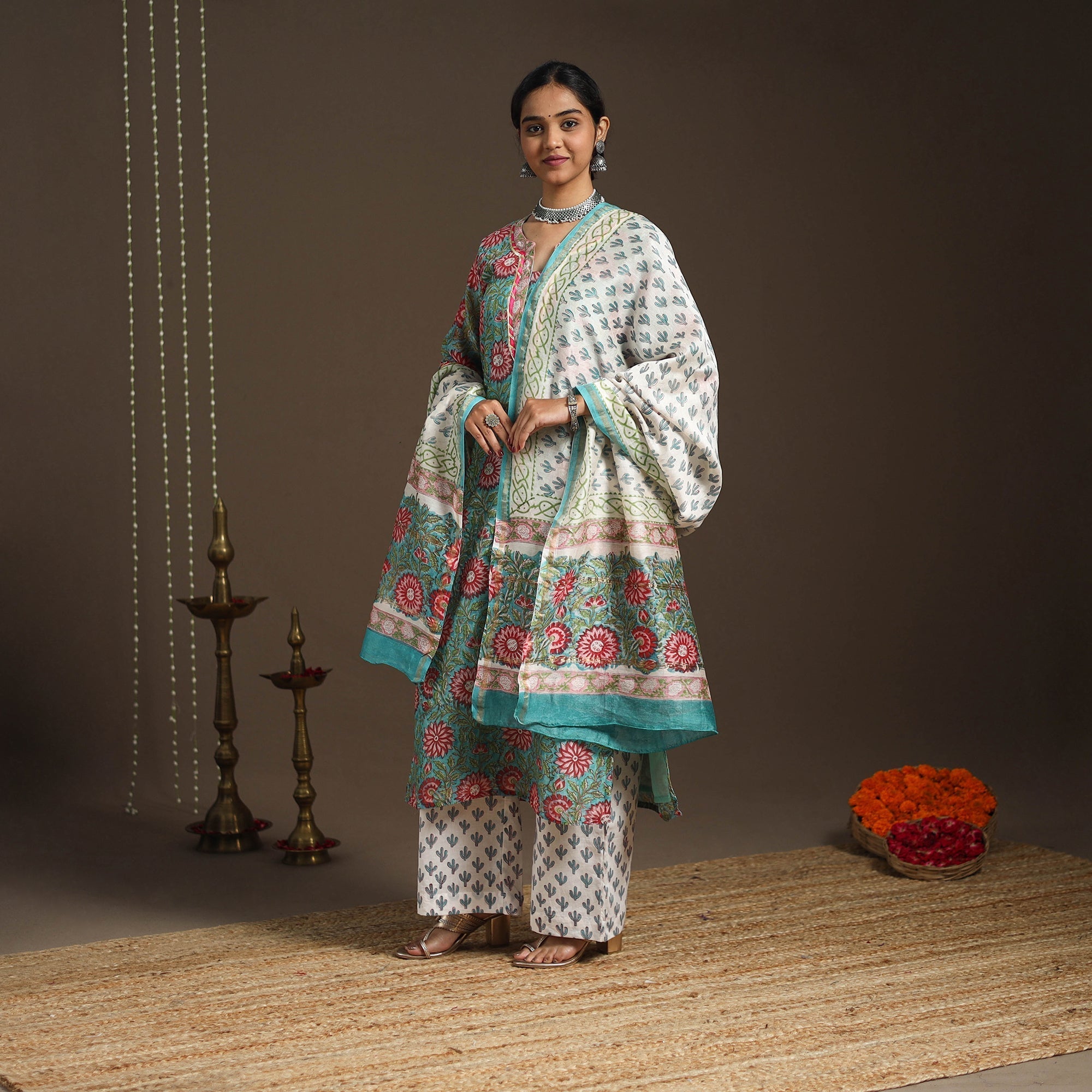 | Material | This green sanganeri block print gota work kurta set includes a chanderi silk-cotton straight kurta with a side pocket, a cotton palazzo with pockets, and a graceful dupatta. The set combines traditional elegance with everyday ease, making it perfect for festive gatherings or casual outings. It beautifully reflects the charm of heritage while offering modern comfort. |