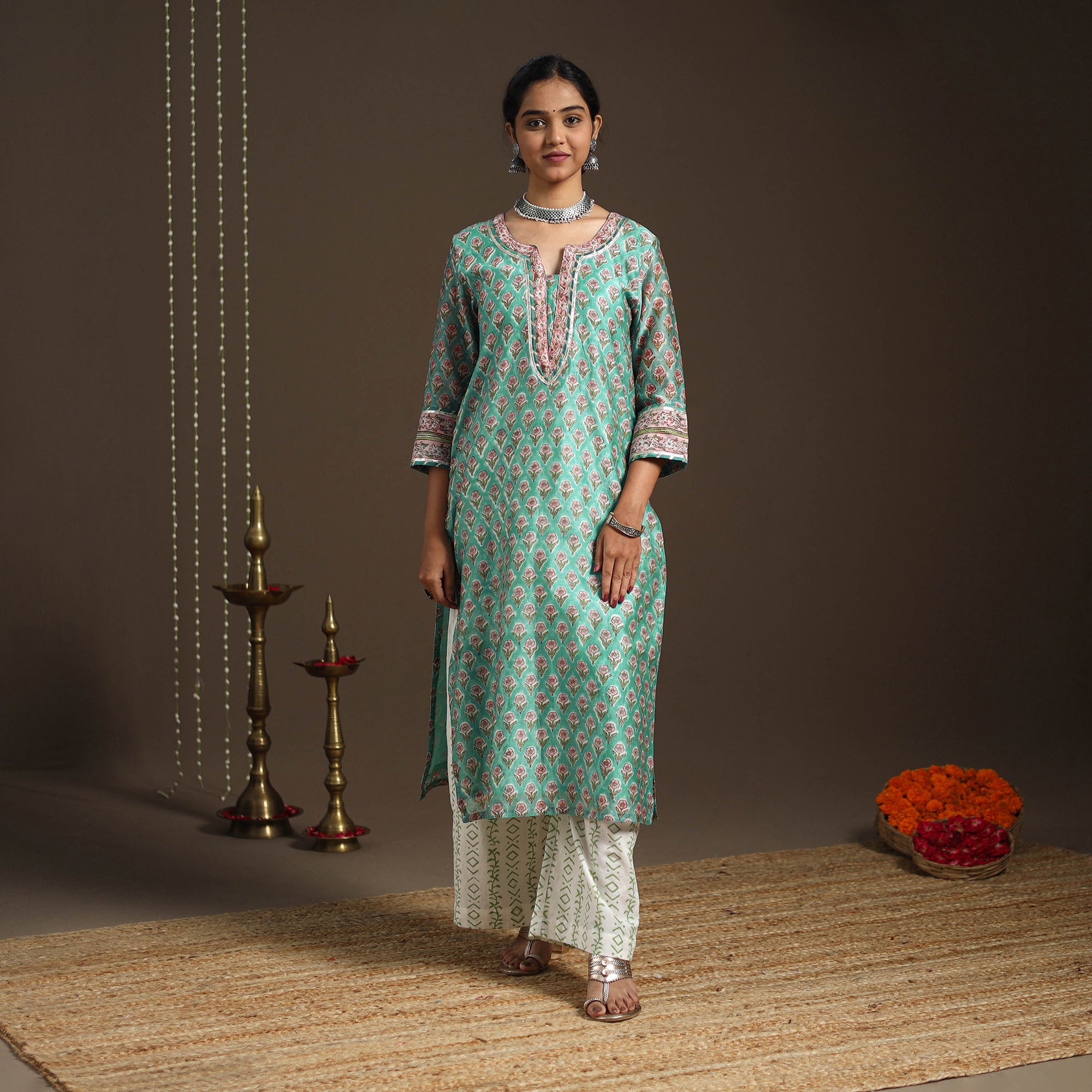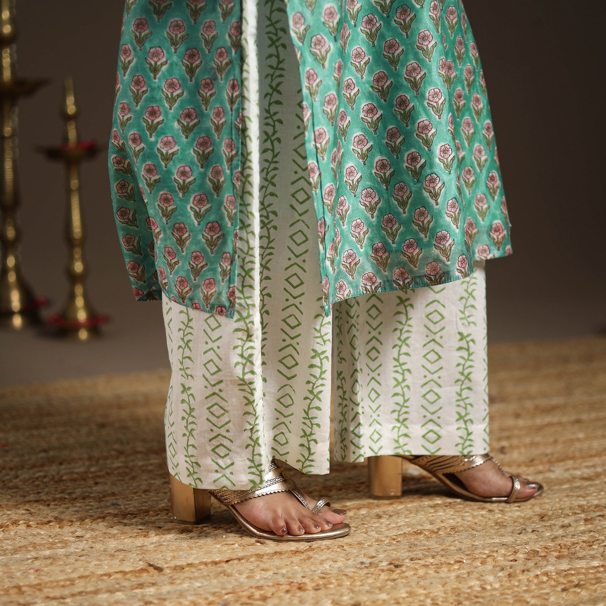 This green sanganeri block print gota work kurta set includes a chanderi silk-cotton straight kurta with a side pocket, a cotton palazzo with pockets, and a graceful dupatta. The set combines traditional elegance with everyday ease, making it perfect for festive gatherings or casual outings. It beautifully reflects the charm of heritage while offering modern comfort.