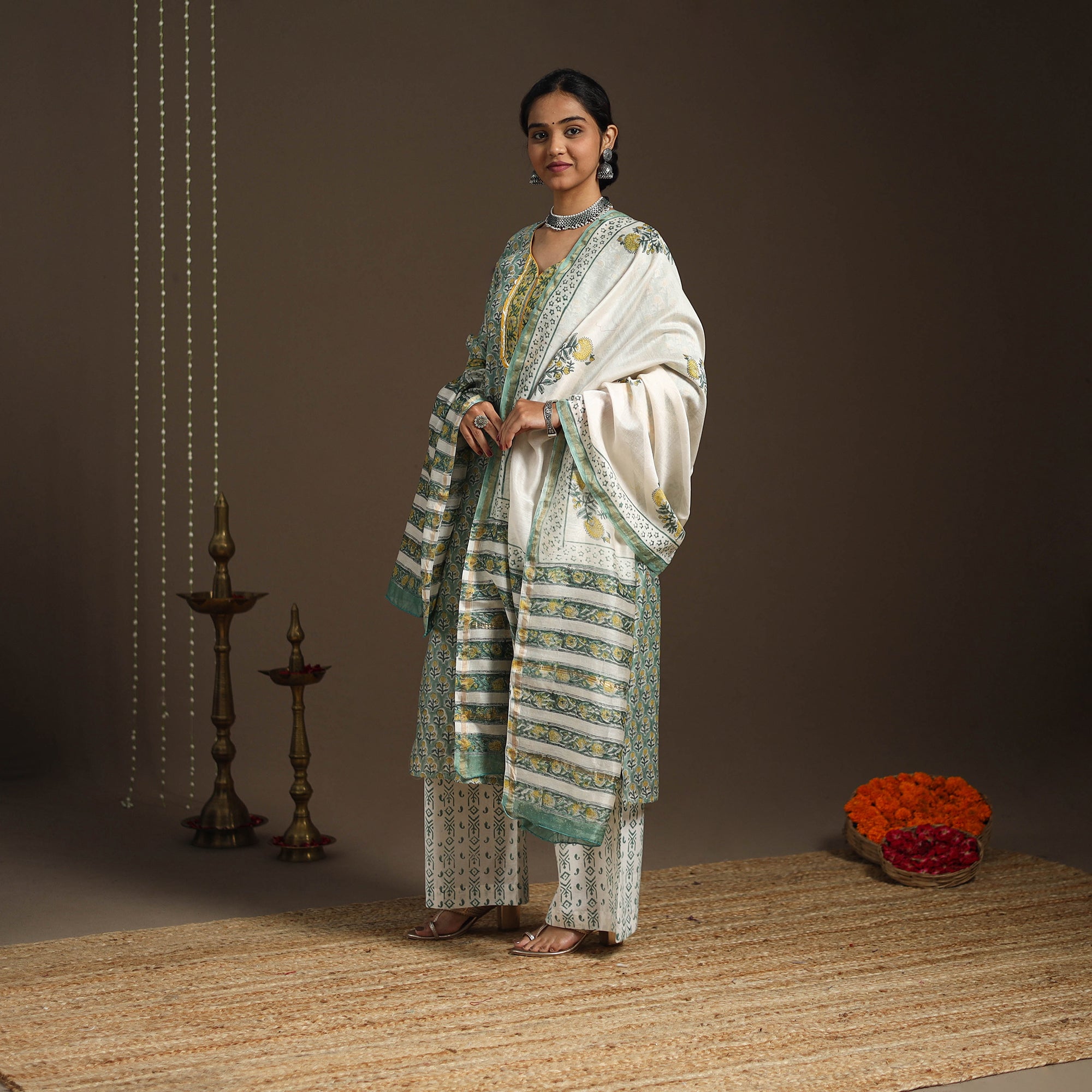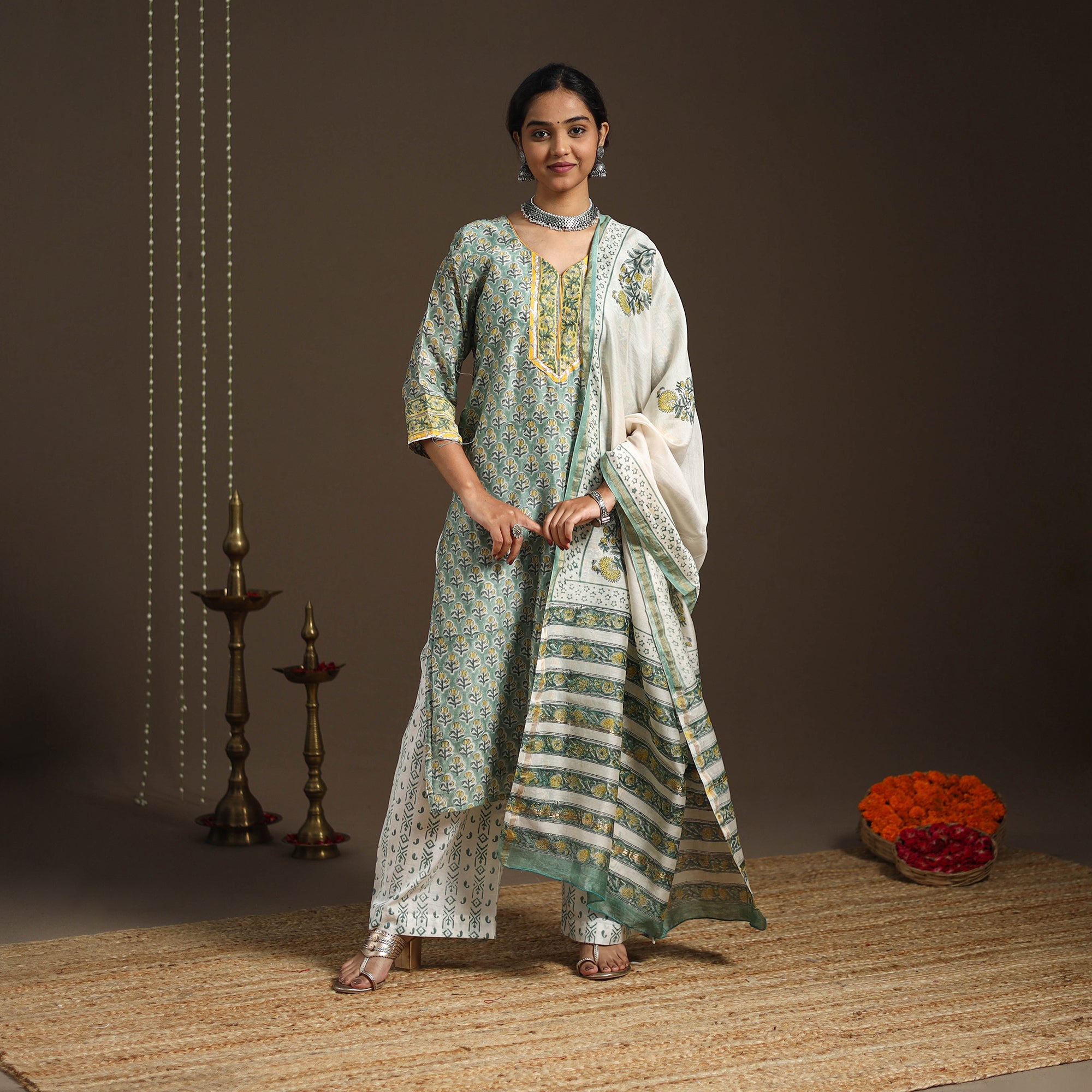 This green sanganeri block print gota work kurta set includes a chanderi silk-cotton straight kurta with a side pocket, a cotton palazzo with pockets, and a graceful dupatta. The set combines traditional elegance with everyday ease, making it perfect for festive gatherings or casual outings. It beautifully reflects the charm of heritage while offering modern comfort.