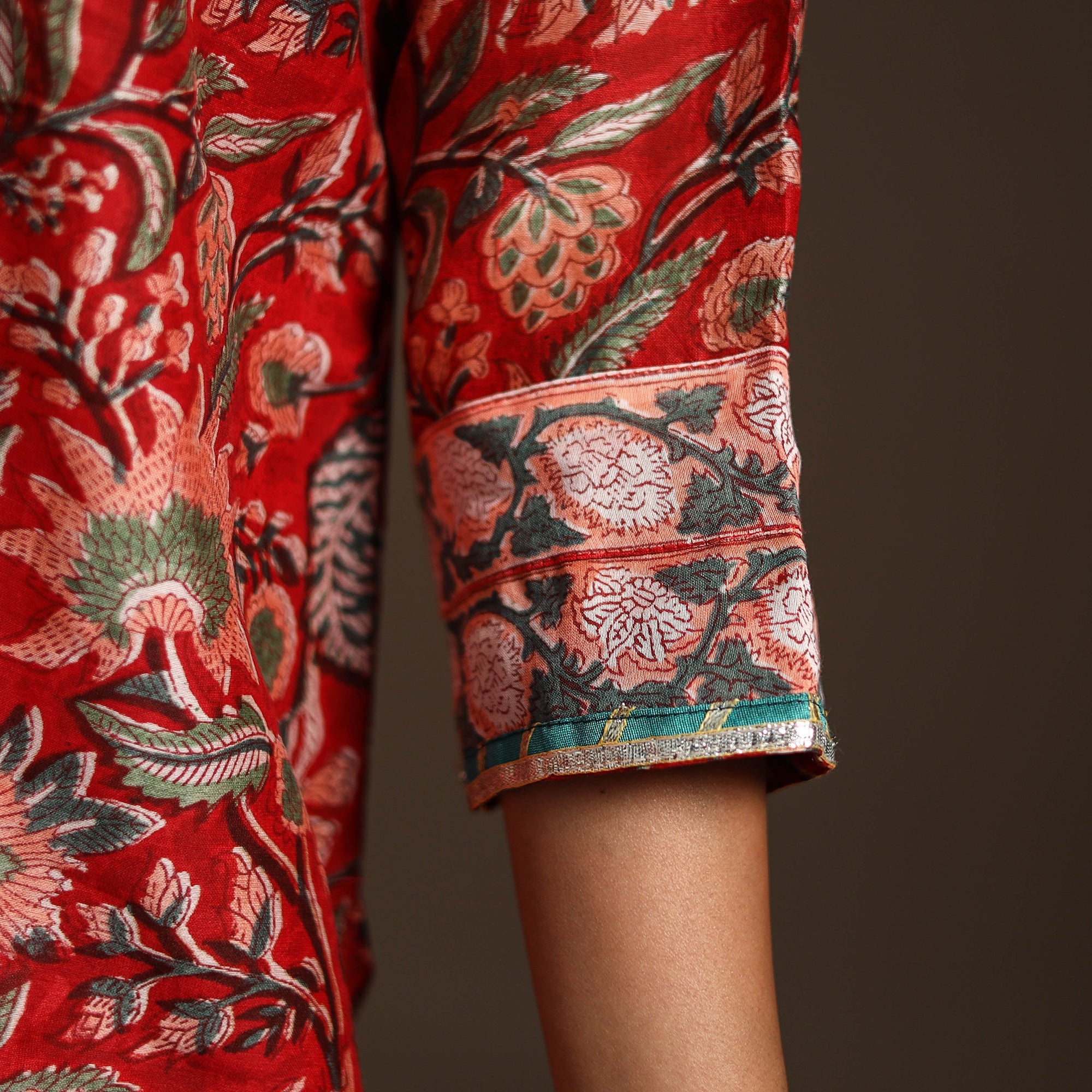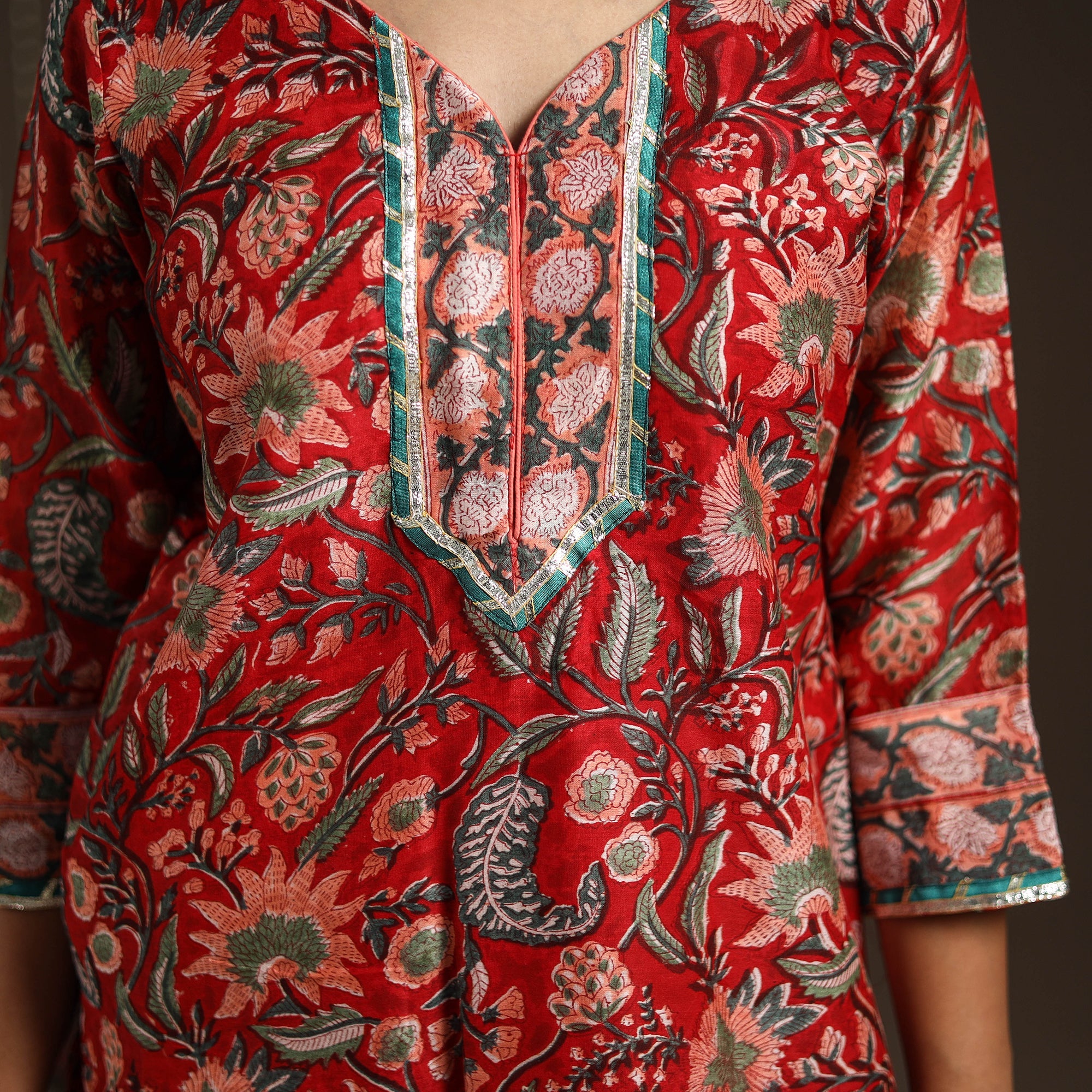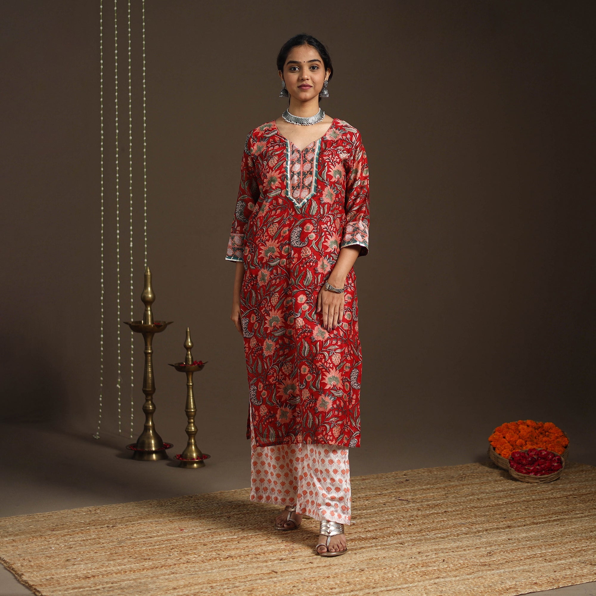 This red sanganeri block print gota work kurta set includes a chanderi silk-cotton straight kurta with a side pocket, a cotton palazzo with pockets, and a graceful dupatta. The set combines traditional elegance with everyday ease, making it perfect for festive gatherings or casual outings. It beautifully reflects the charm of heritage while offering modern comfort.