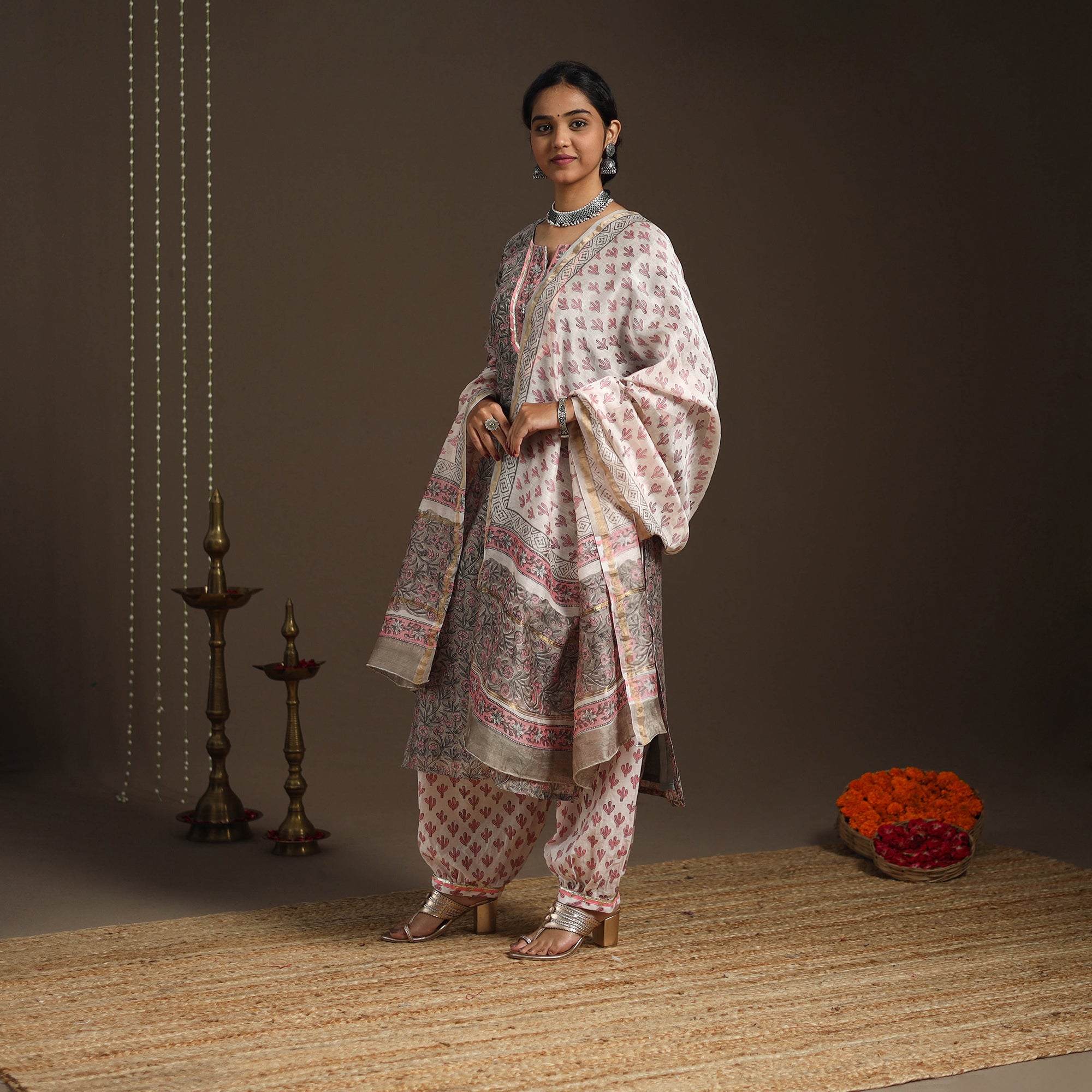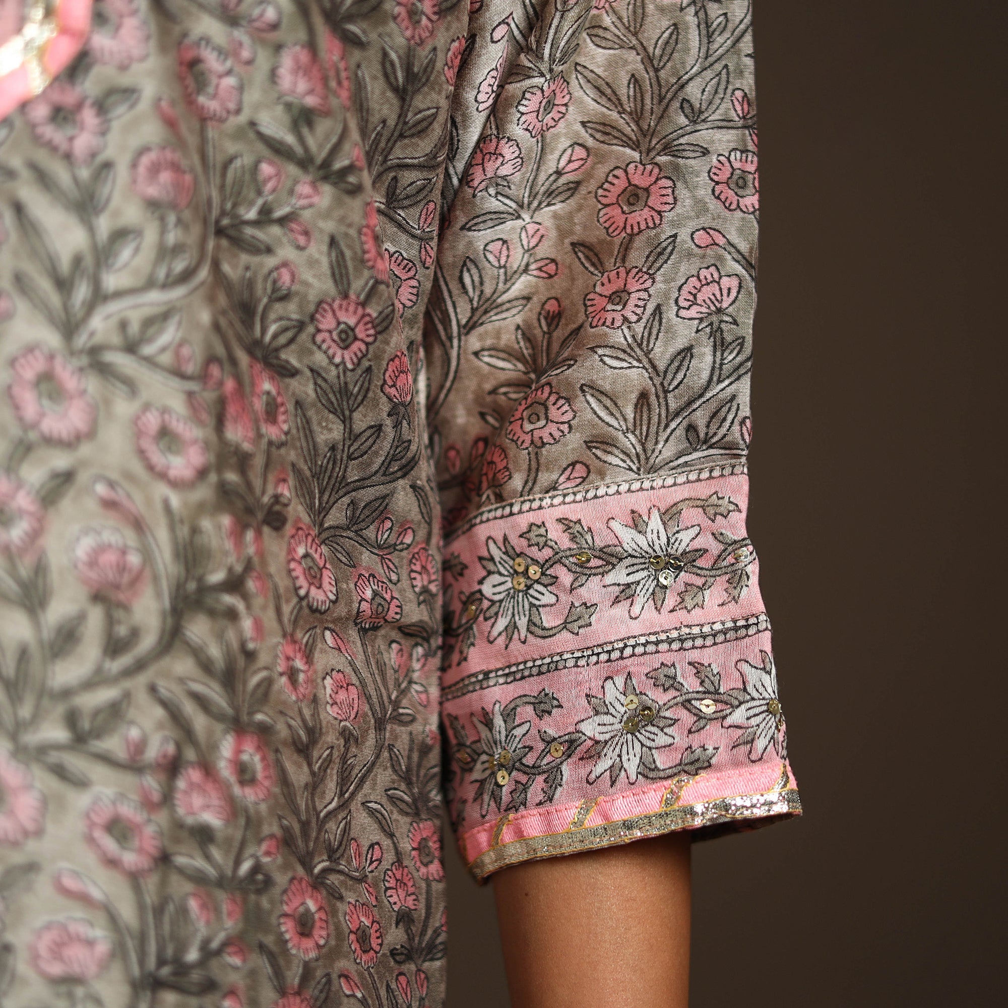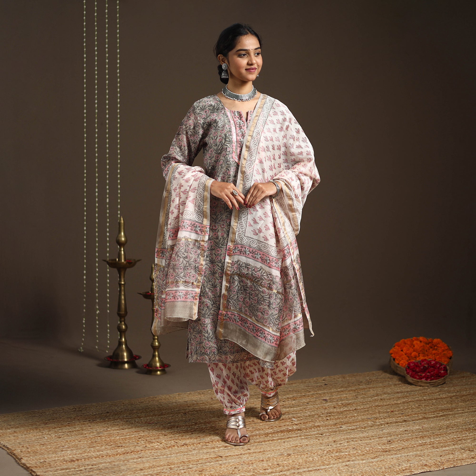 This grey sanganeri block print gota work kurta set features a chanderi silk-cotton straight kurta with a side pocket, a cotton afghani salwar, and a graceful dupatta. The set blends ethnic charm with everyday ease, making it ideal for festive gatherings or casual day-outs. It perfectly captures the essence of tradition with a touch of modern comfort.