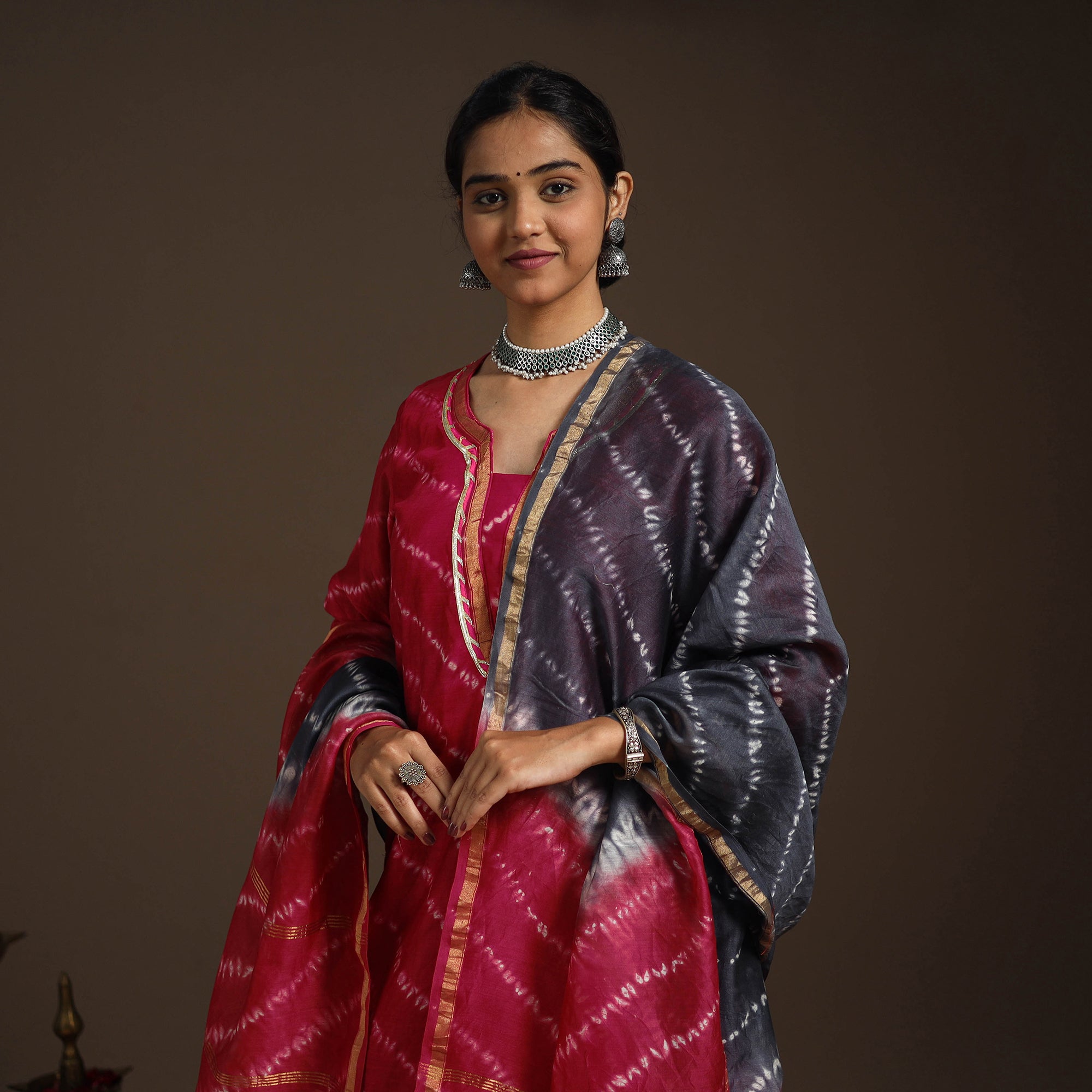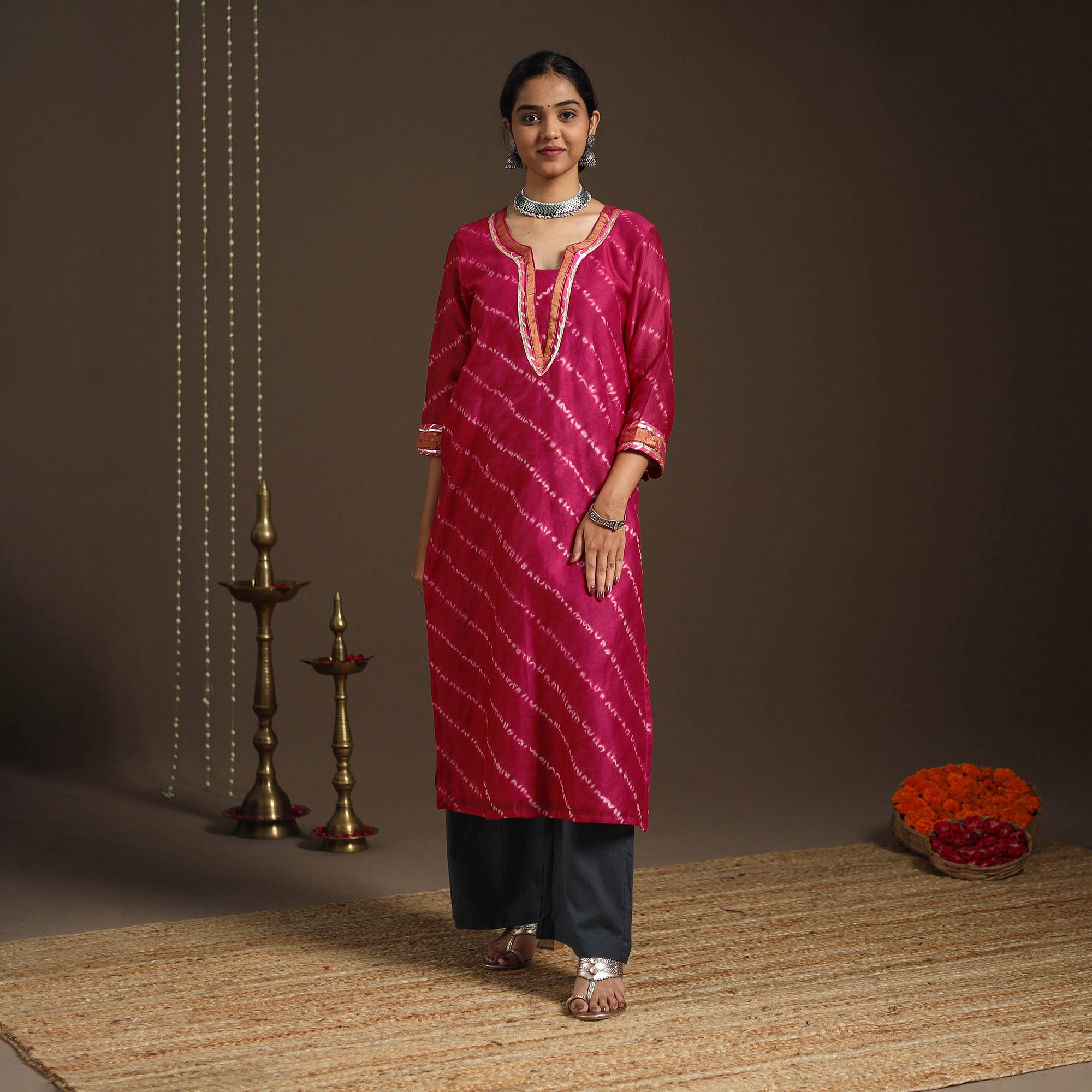 This pink shibori tie-dye gota work kurta set features a straight chanderi silk-cotton kurta with a side pocket, paired with a cotton palazzo with pockets and a graceful dupatta. The ensemble blends ethnic charm with everyday ease, making it perfect for festive gatherings or casual outings. It beautifully reflects traditional artistry while offering a touch of modern comfort.