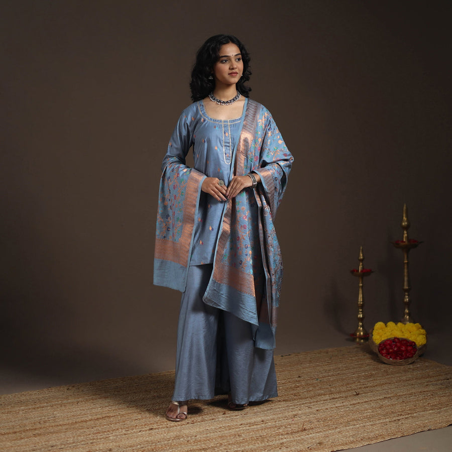 This blue gota work meena weaving silk cotton banarasi kurta set is designed to bring a regal charm to your festive wardrobe. The short kurta features exquisite zari weaving that reflects banarasi artistry. It is paired with a plain, flared palazzo featuring a comfortable elasticated waist for ease of wear and graceful movement. A coordinated Banarasi dupatta completes the ensemble, making it an ideal choice for weddings, poojas, and grand gatherings where traditional charm meets modern style.