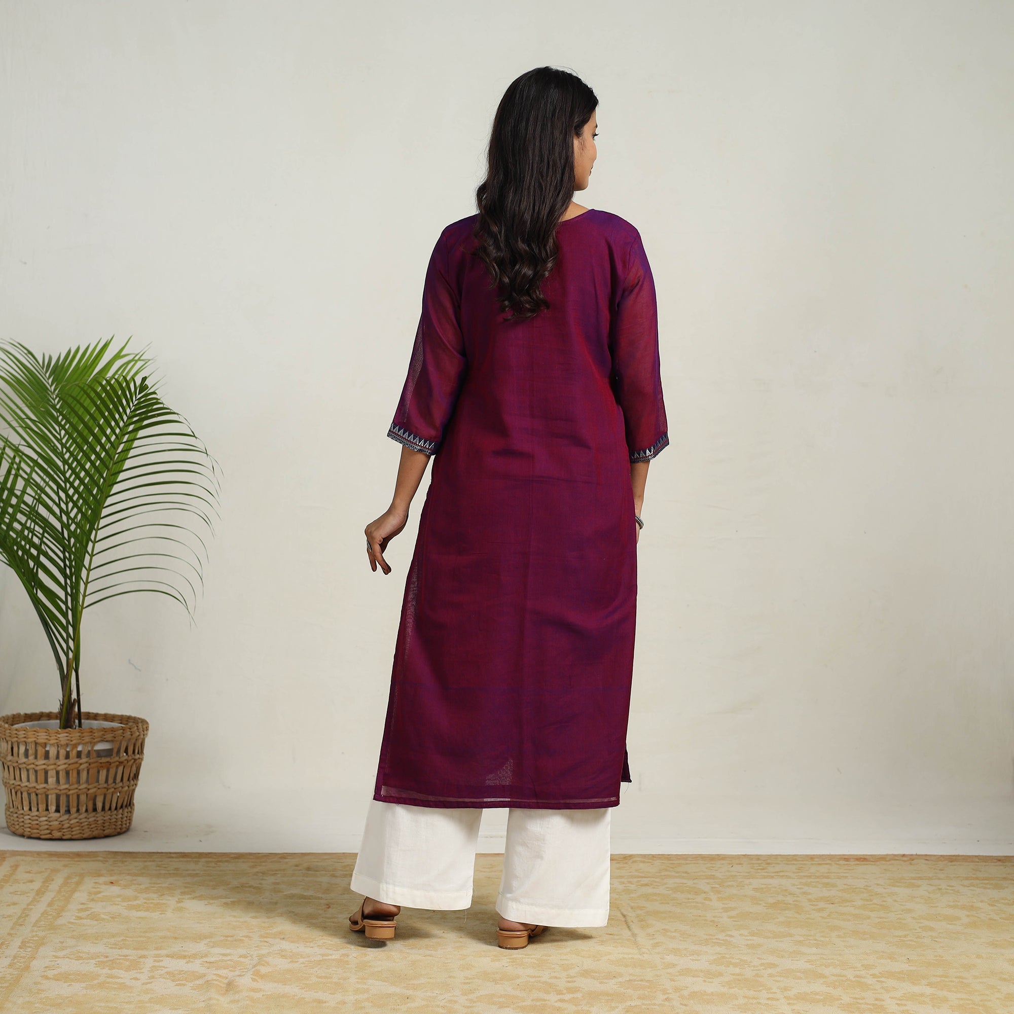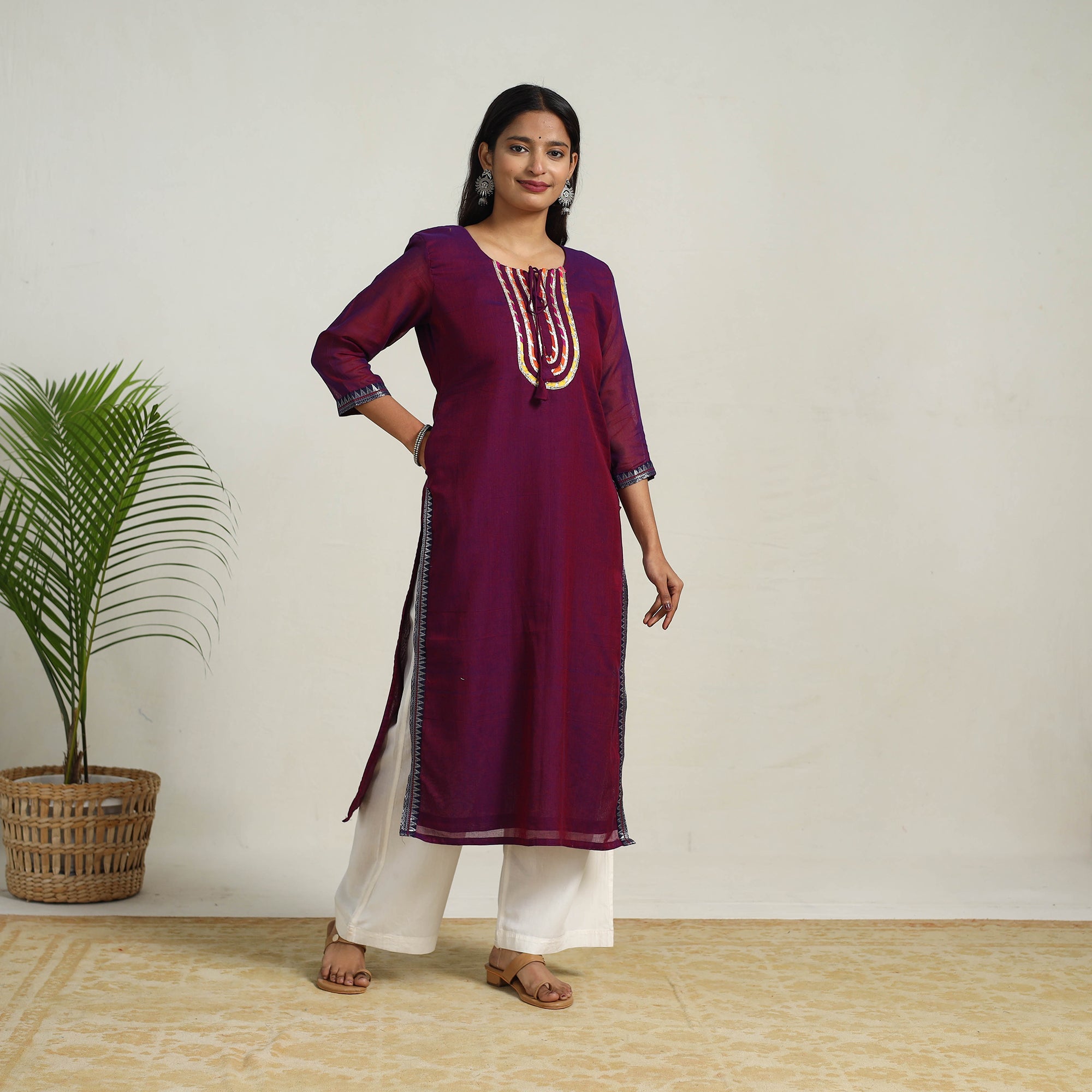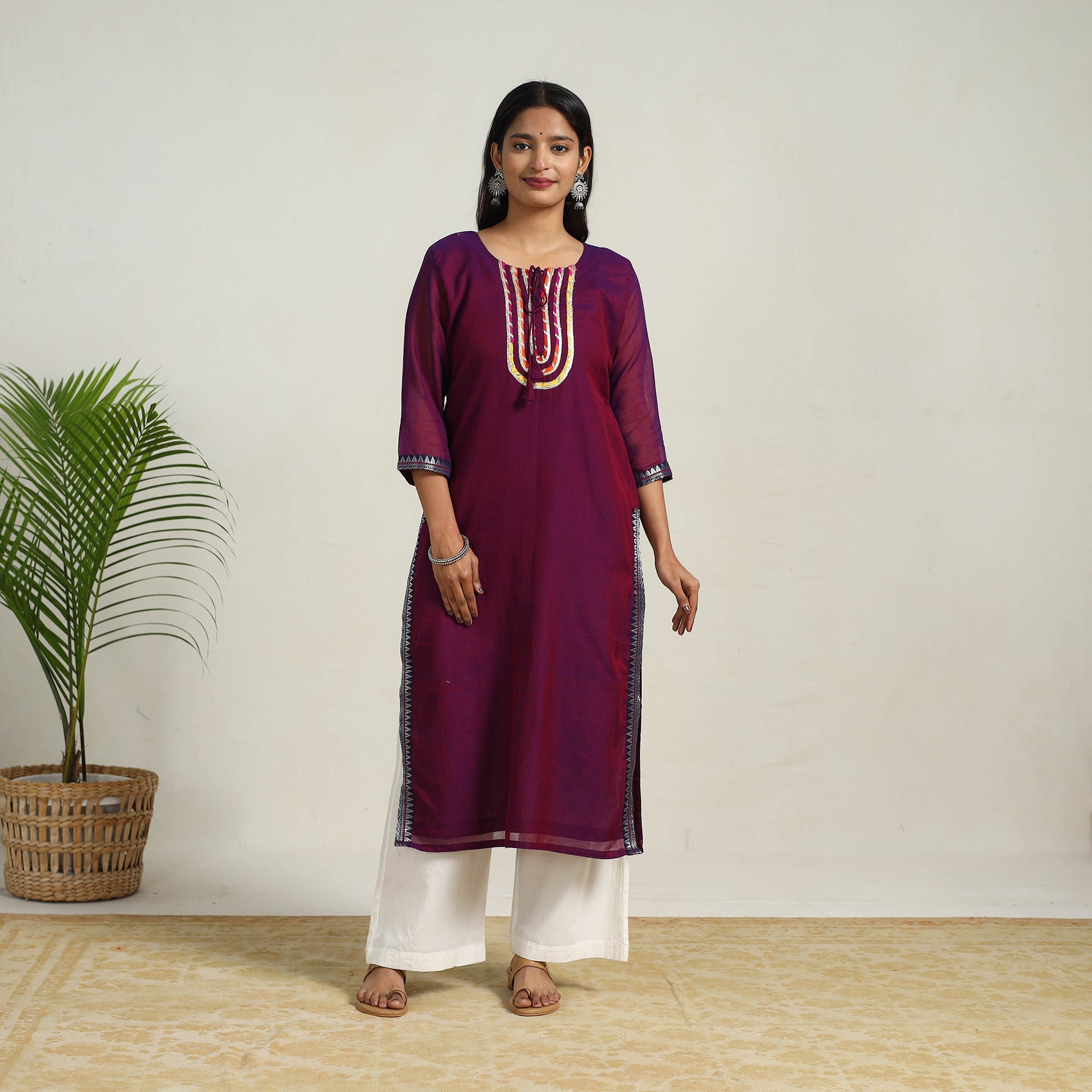 Purple gota work mercerised cotton straight dharwad kurta. This kurta features unique dharwad border designs and a handy side pocket. Crafted from mercerised cotton for comfort and style. The dharwad region is renowned for its exquisite textile heritage, and this kurta reflects that rich tradition.