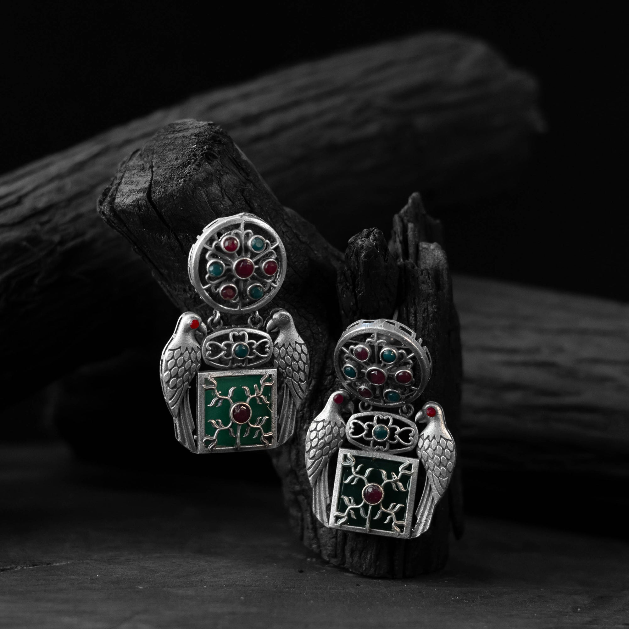 Green oxidised handcrafted earrings made with a blend of metal, stones and fine detailing. Perfect for festive occasions, weddings, casual outings, office wear, or vacations. Their elegant black and silver tones pair beautifully with everything from casual jeans and flowy dresses to chic office ensembles. A meaningful gift for mother, sister, wife, or girlfriend adding a beautiful touch of tradition to every moment.