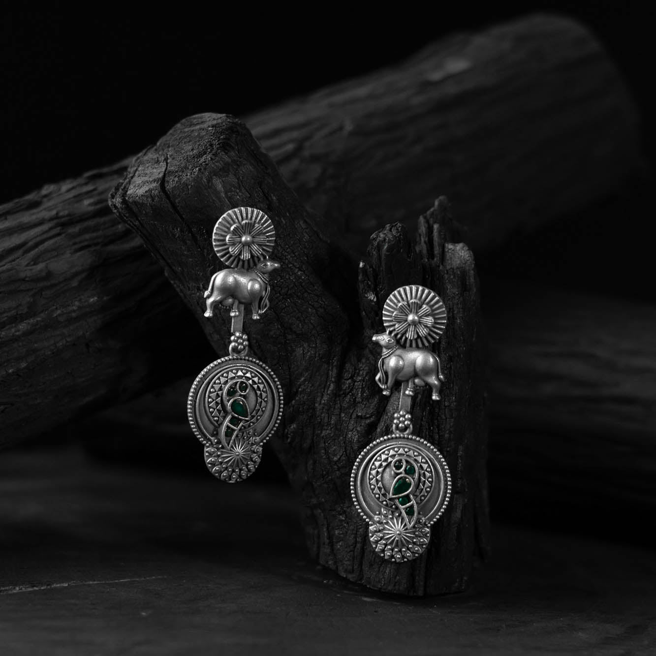 Oxidised handcrafted green earrings made with a blend of metal, stones and fine detailing. Perfect for festive occasions, weddings, casual outings, office wear, or vacations. Their elegant black and silver tones pair beautifully with everything from casual jeans and flowy dresses to chic office ensembles. A meaningful gift for mother, sister, wife, or girlfriend adding a beautiful touch of tradition to every moment.