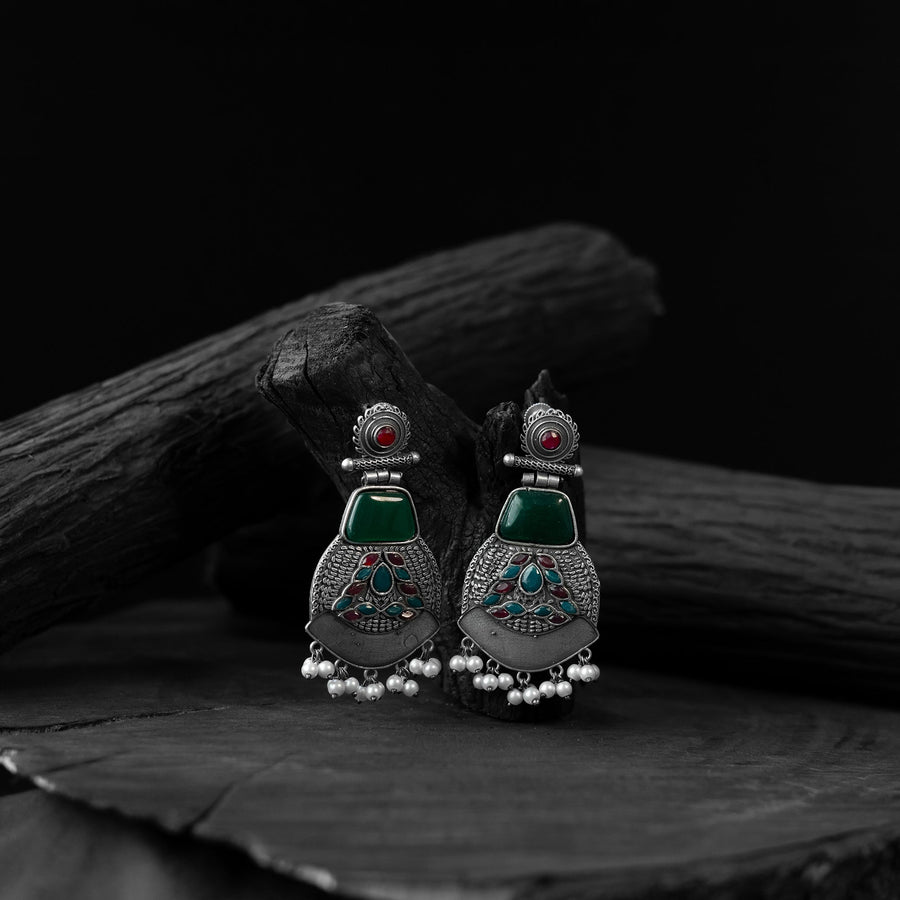 Green oxidised handcrafted earrings made with a blend of metal, stones, pearls, beads, and fine detailing. Perfect for festive occasions, weddings, casual outings, office wear, or vacations. Their elegant black and silver tones pair beautifully with everything from casual jeans and flowy dresses to chic office ensembles. A meaningful gift for mother, sister, wife, or girlfriend adding a beautiful touch of tradition to every moment.