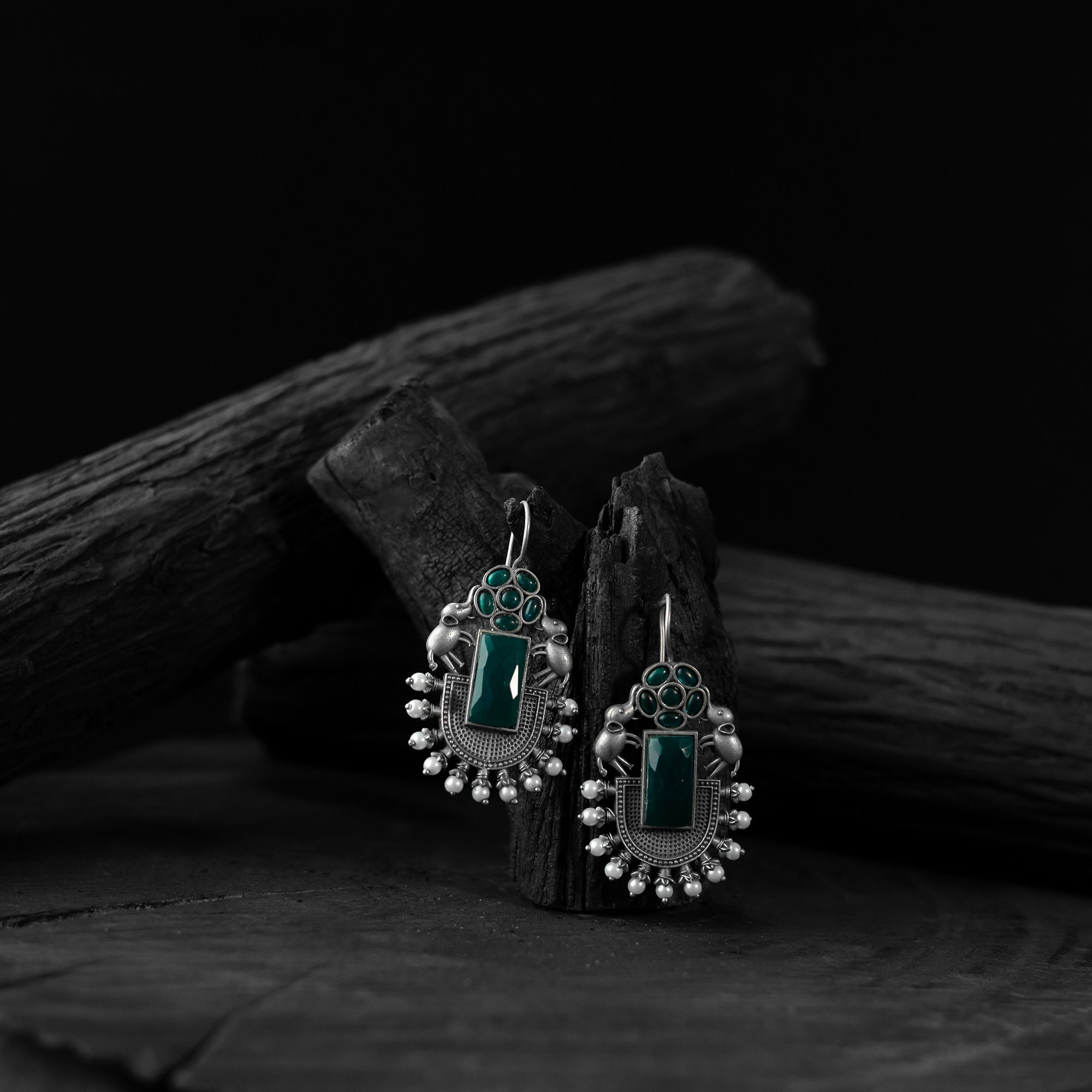 Oxidised handcrafted green earrings made with a blend of metal, stones, pearls, beads, and fine detailing. Perfect for festive occasions, weddings, casual outings, office wear, or vacations. Their elegant black and silver tones pair beautifully with everything from casual jeans and flowy dresses to chic office ensembles. A meaningful gift for mother, sister, wife, or girlfriend adding a beautiful touch of tradition to every moment.
