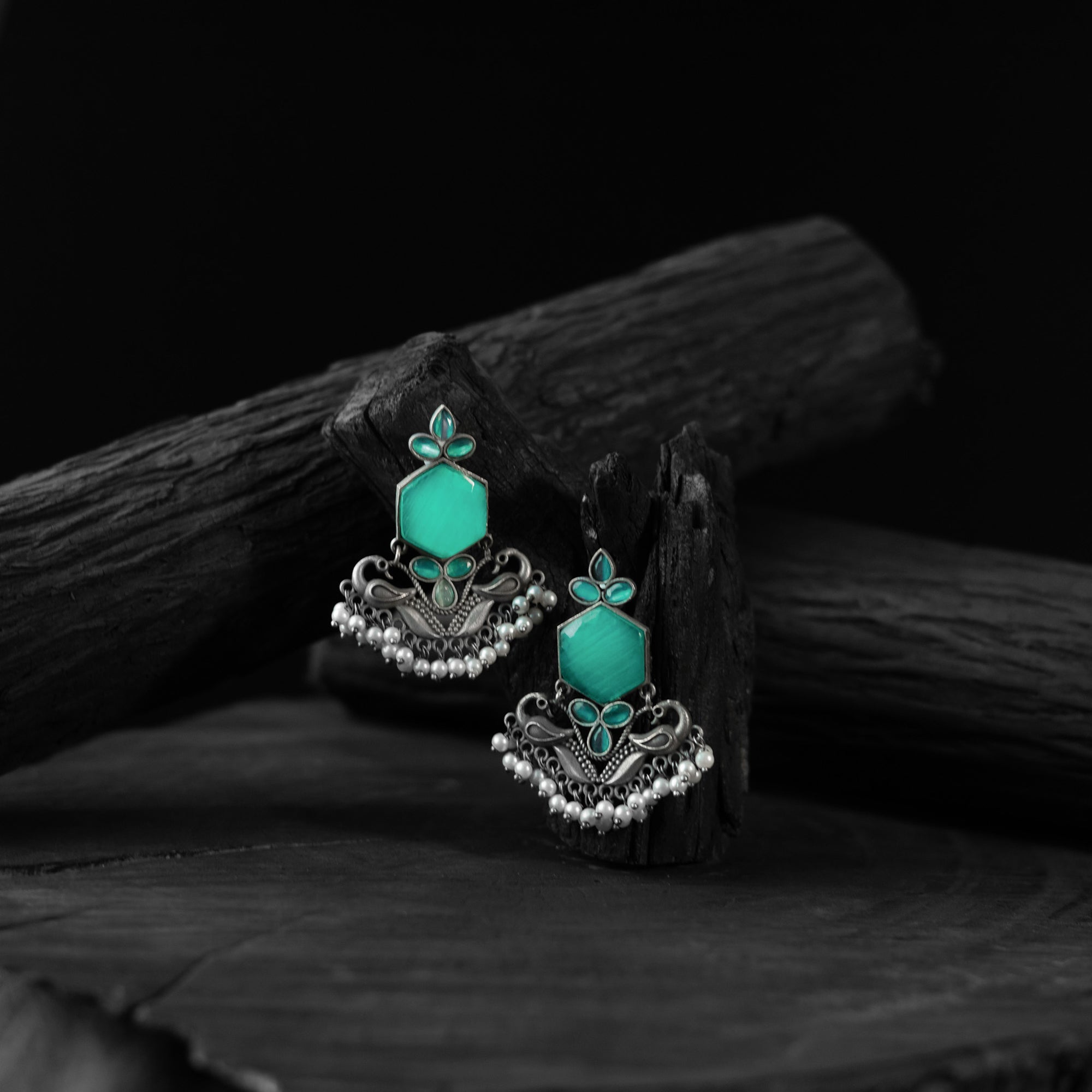 Oxidised handcrafted sea green earrings made with a blend of metal, stones, pearls, beads, and fine detailing. Perfect for festive occasions, weddings, casual outings, office wear, or vacations. Their elegant black and silver tones pair beautifully with everything from casual jeans and flowy dresses to chic office ensembles. A meaningful gift for mother, sister, wife, or girlfriend adding a beautiful touch of tradition to every moment.