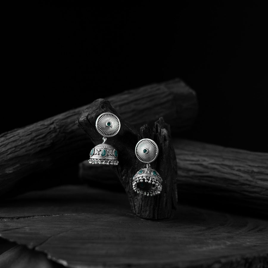 Oxidised handcrafted green jhumka earrings made with a blend of metal, stones, pearls, beads, and fine detailing. Perfect for festive occasions, weddings, casual outings, office wear, or vacations. Their elegant black and silver tones pair beautifully with everything from casual jeans and flowy dresses to chic office ensembles. A meaningful gift for mother, sister, wife, or girlfriend adding a beautiful touch of tradition to every moment.