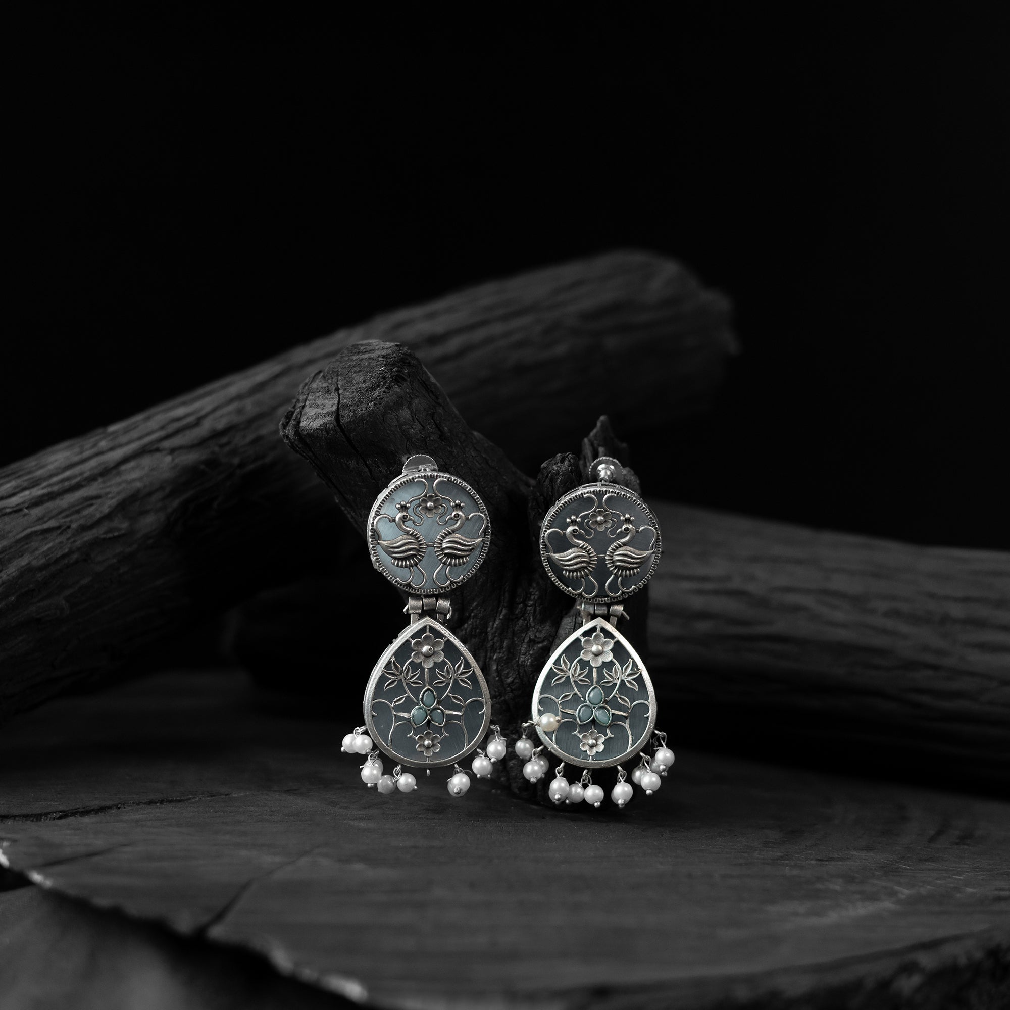 Grey oxidised handcrafted earrings made with a blend of metal, stones, pearls, beads, and fine detailing. Perfect for festive occasions, weddings, casual outings, office wear, or vacations. Their elegant black and silver tones pair beautifully with everything from casual jeans and flowy dresses to chic office ensembles. A meaningful gift for mother, sister, wife, or girlfriend adding a beautiful touch of tradition to every moment.