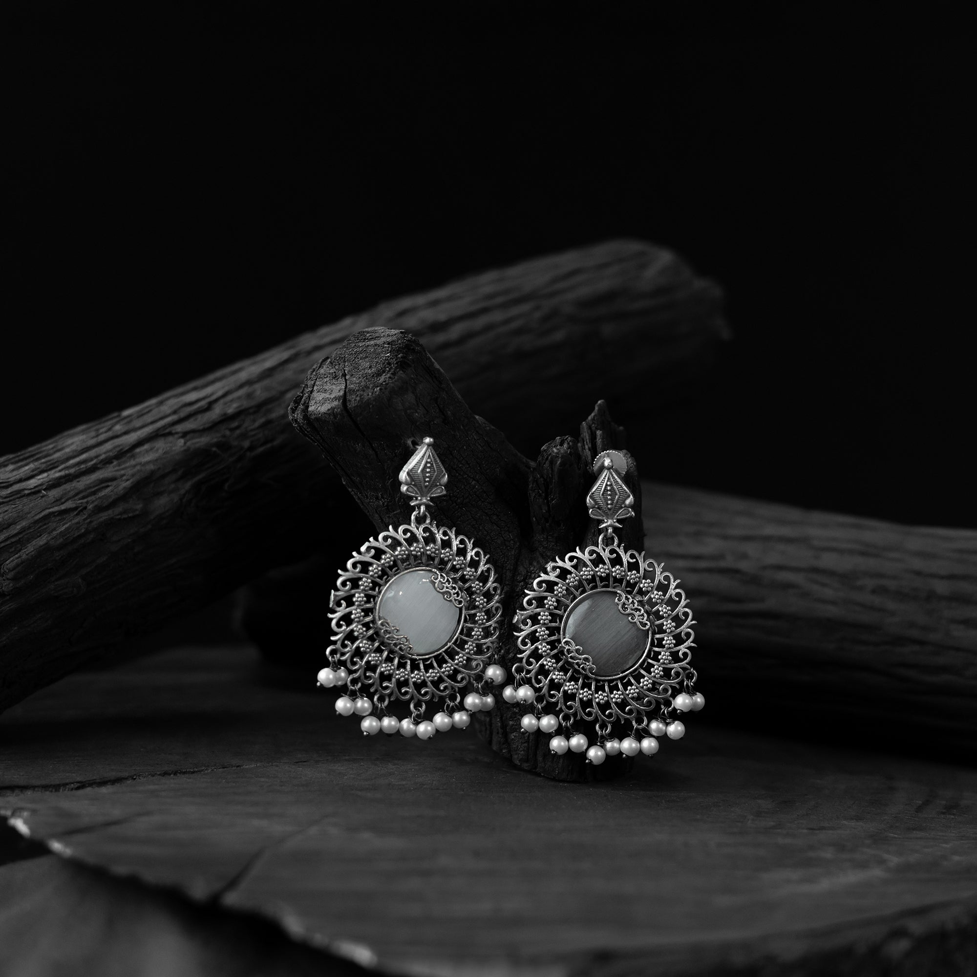 Grey oxidised handcrafted earrings made with a blend of metal, stones, pearls, beads, and fine detailing. Perfect for festive occasions, weddings, casual outings, office wear, or vacations. Their elegant black and silver tones pair beautifully with everything from casual jeans and flowy dresses to chic office ensembles. A meaningful gift for mother, sister, wife, or girlfriend adding a beautiful touch of tradition to every moment.