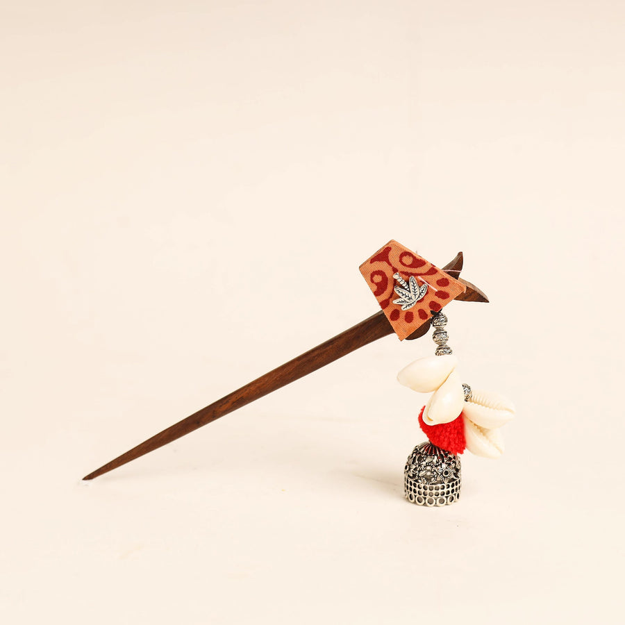 Elevate your traditional look with this gs shell work wooden handmade juda stick. Crafted with fabric, german silver, shells, and pom poms, each piece is uniquely designed. Ideal for casual or festive occasions, it adds a vibrant cultural touch to your hairstyle.