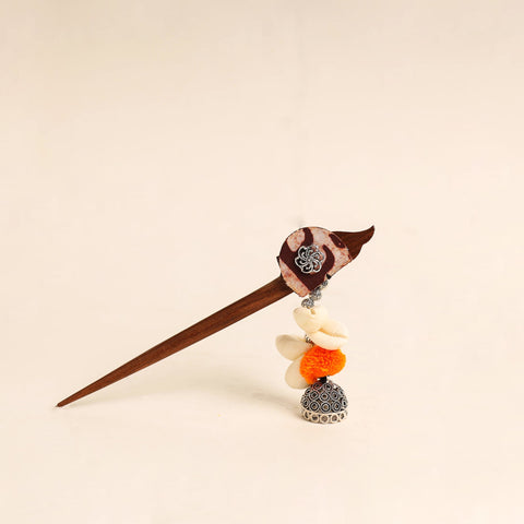 Elevate your traditional look with this gs shell work wooden handmade juda stick. Crafted with fabric, german silver, shells, and pom poms, each piece is uniquely designed. Ideal for casual or festive occasions, it adds a vibrant cultural touch to your hairstyle.