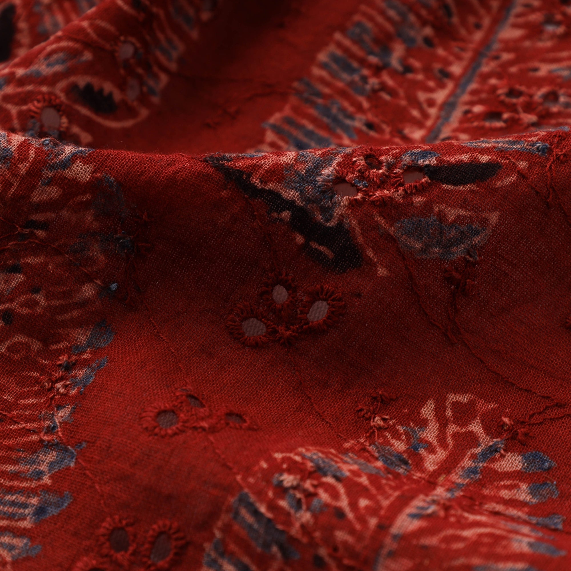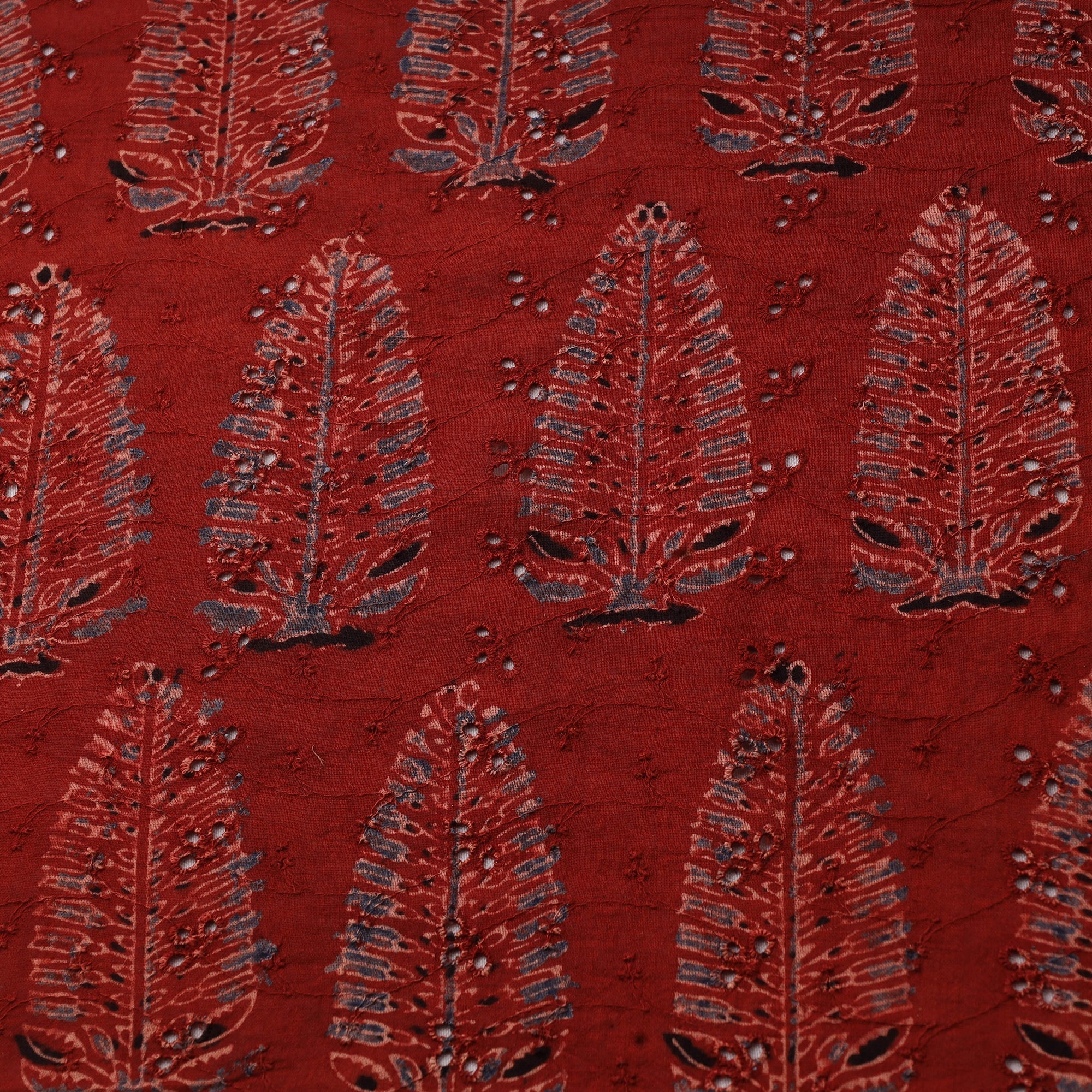 Red hakoba natural-dyed embroidered cotton ajrakh print fabric from Kutch, Gujarat. Crafted using natural dyes and a 4,500-year-old resist hand-block printing technique, this fabric blends timeless elegance with everyday comfort. Featuring airy cutwork embroidery and delicate eyelet patterns, hakoba is a beloved choice for blouses, kurtis, sarees and dresses. The soft cotton base ensures breathability, making it ideal for all-day wear.