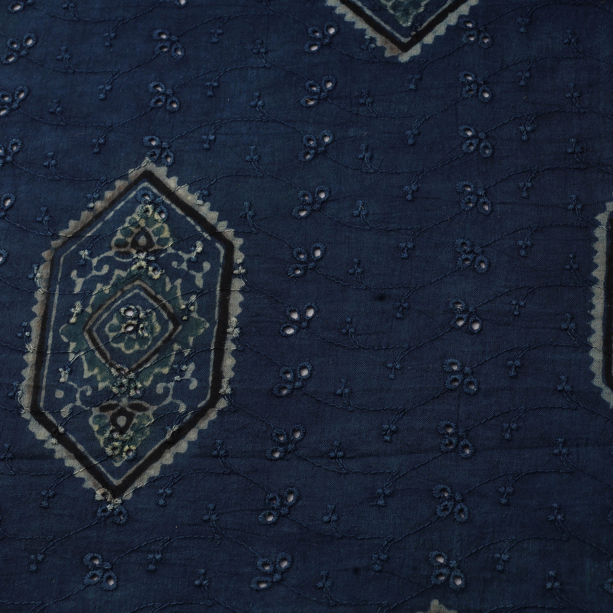 Blue hakoba natural-dyed embroidered cotton ajrakh print fabric from Kutch, Gujarat. Crafted using natural dyes and a 4,500-year-old resist hand-block printing technique, this fabric blends timeless elegance with everyday comfort. Featuring airy cutwork embroidery and delicate eyelet patterns, hakoba is a beloved choice for blouses, kurtis, sarees and dresses. The soft cotton base ensures breathability, making it ideal for all-day wear.