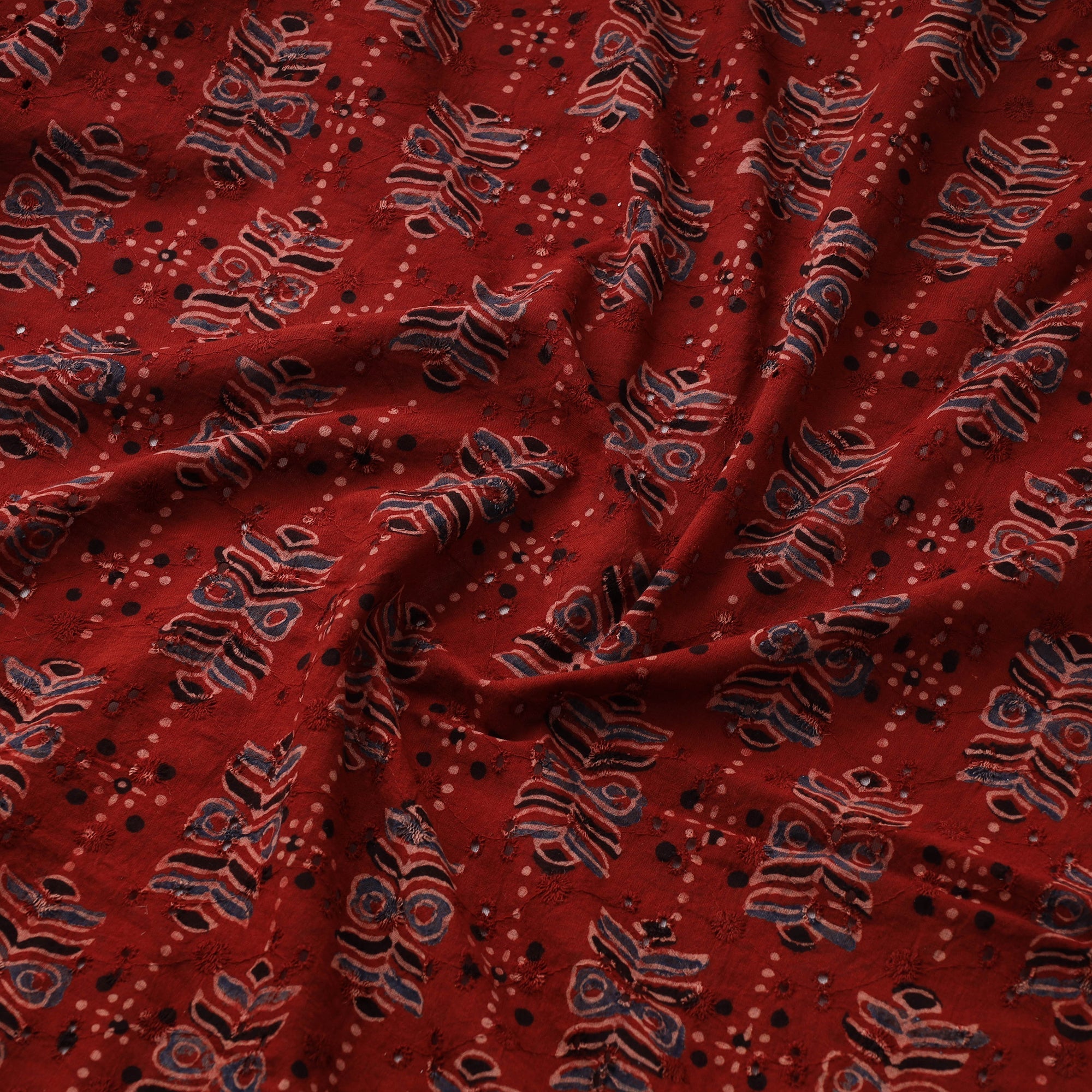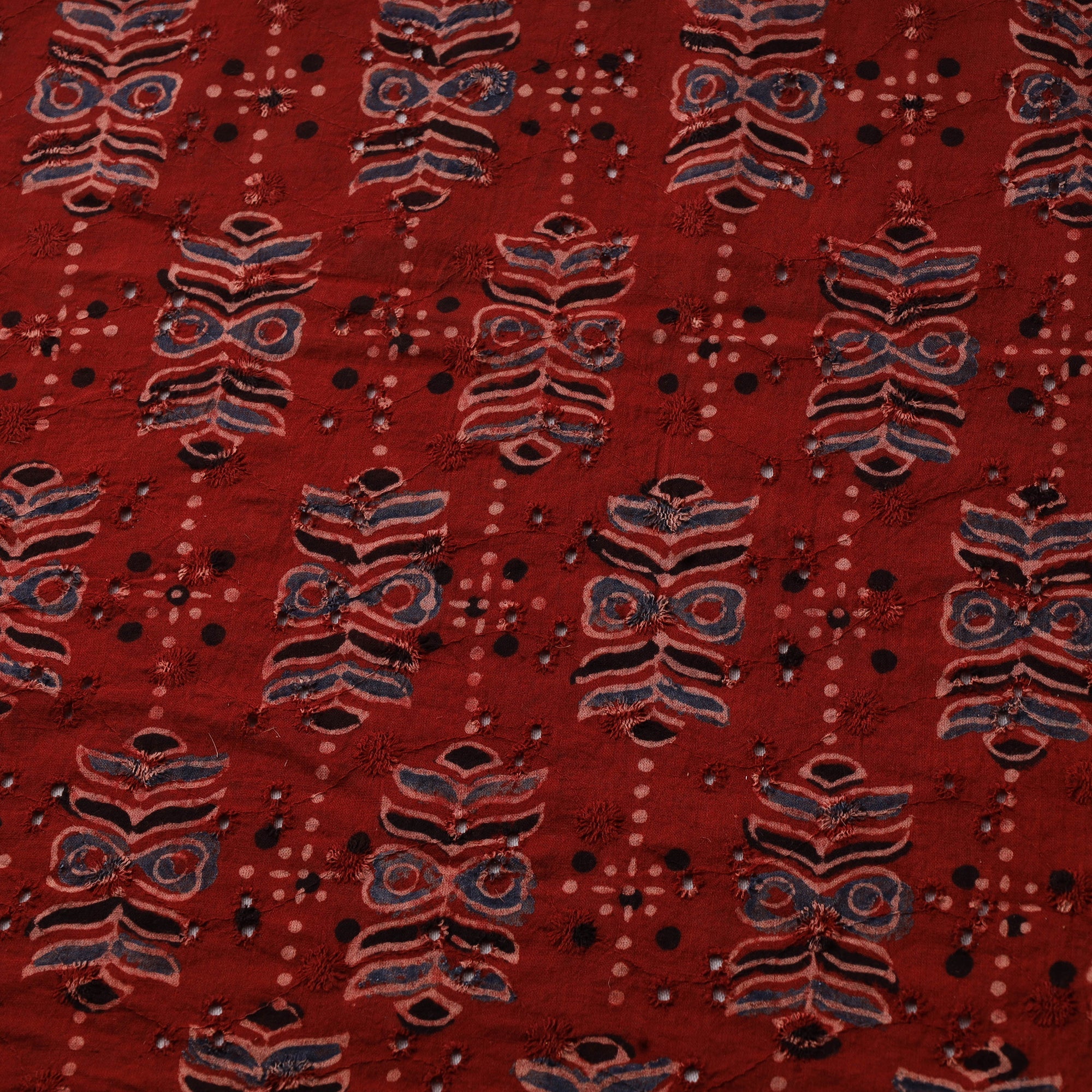 Red hakoba natural-dyed embroidered cotton ajrakh print fabric from Kutch, Gujarat. Crafted using natural dyes and a 4,500-year-old resist hand-block printing technique, this fabric blends timeless elegance with everyday comfort. Featuring airy cutwork embroidery and delicate eyelet patterns, hakoba is a beloved choice for blouses, kurtis, sarees and dresses. The soft cotton base ensures breathability, making it ideal for all-day wear.