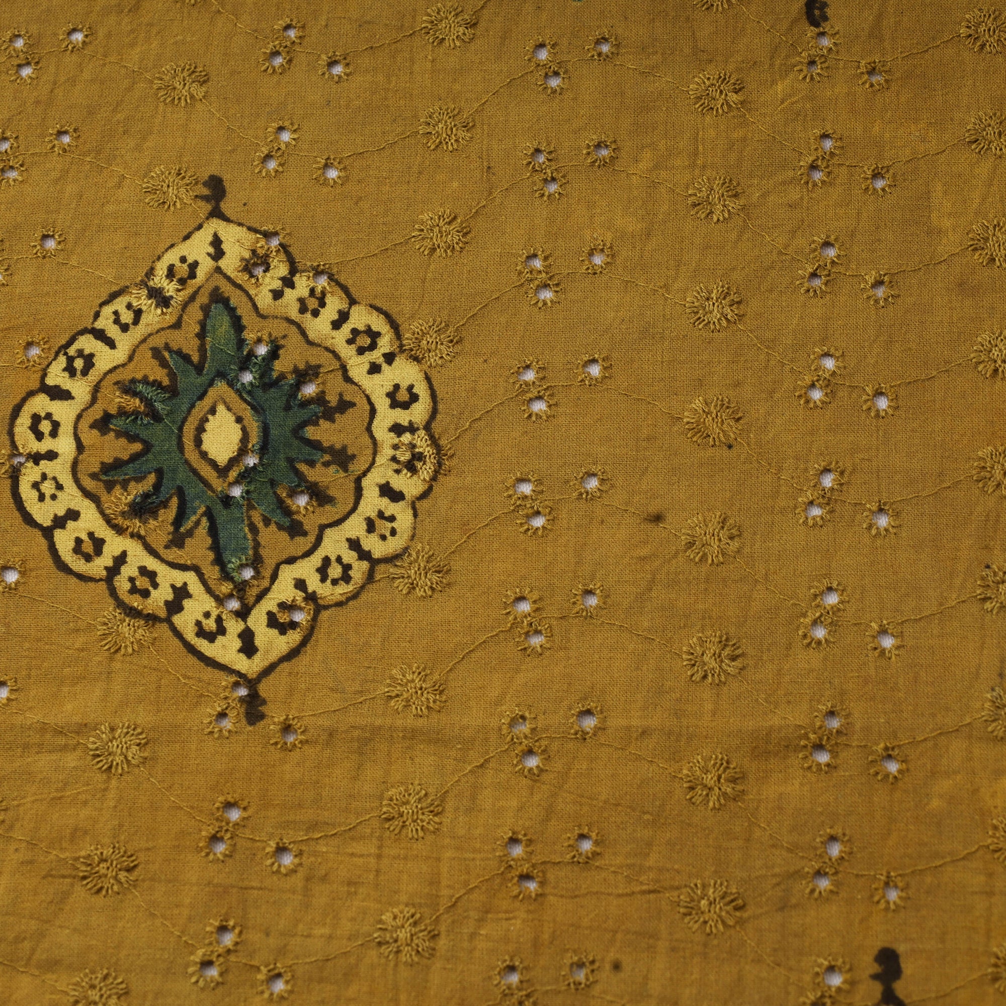 Yellow hakoba natural-dyed embroidered cotton ajrakh print fabric from Kutch, Gujarat. Crafted using natural dyes and a 4,500-year-old resist hand-block printing technique, this fabric blends timeless elegance with everyday comfort. Featuring airy cutwork embroidery and delicate eyelet patterns, hakoba is a beloved choice for blouses, kurtis, sarees and dresses. The soft cotton base ensures breathability, making it ideal for all-day wear.