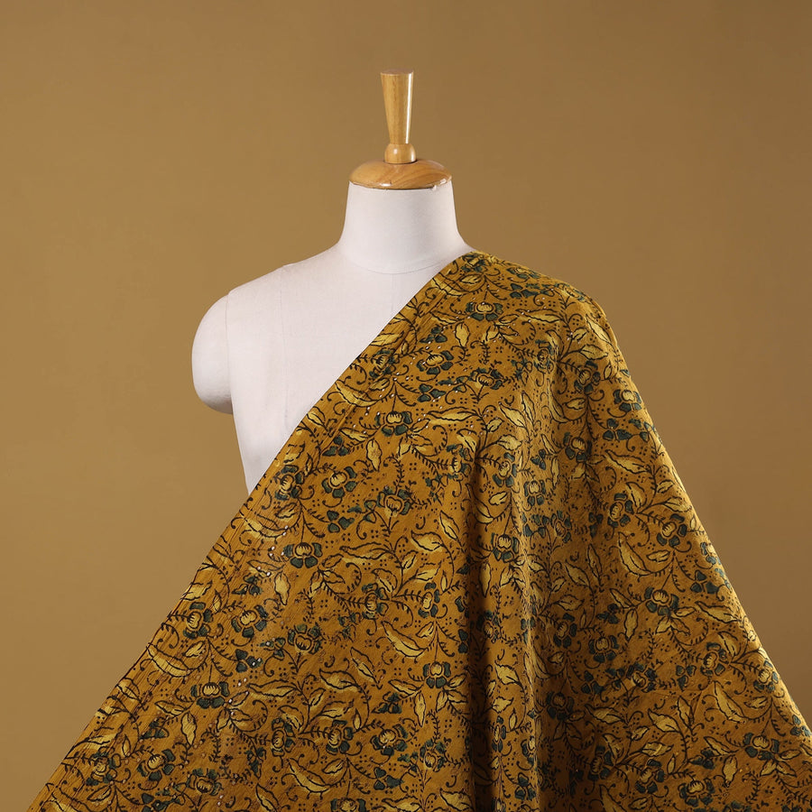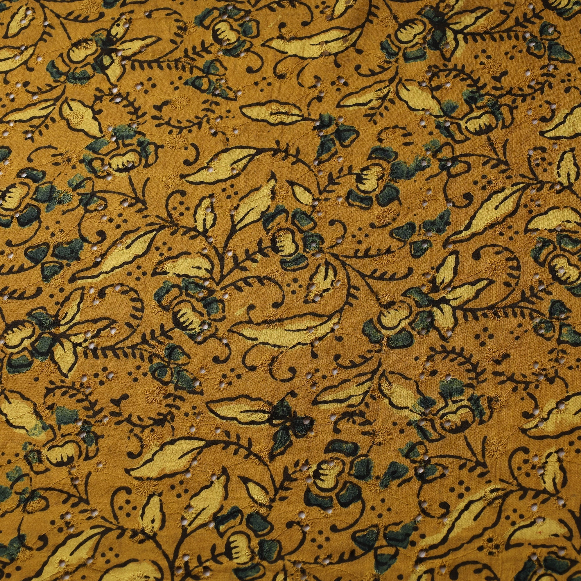 Yellow hakoba natural-dyed embroidered cotton ajrakh print fabric from Kutch, Gujarat. Crafted using natural dyes and a 4,500-year-old resist hand-block printing technique, this fabric blends timeless elegance with everyday comfort. Featuring airy cutwork embroidery and delicate eyelet patterns, hakoba is a beloved choice for blouses, kurtis, sarees and dresses. The soft cotton base ensures breathability, making it ideal for all-day wear.