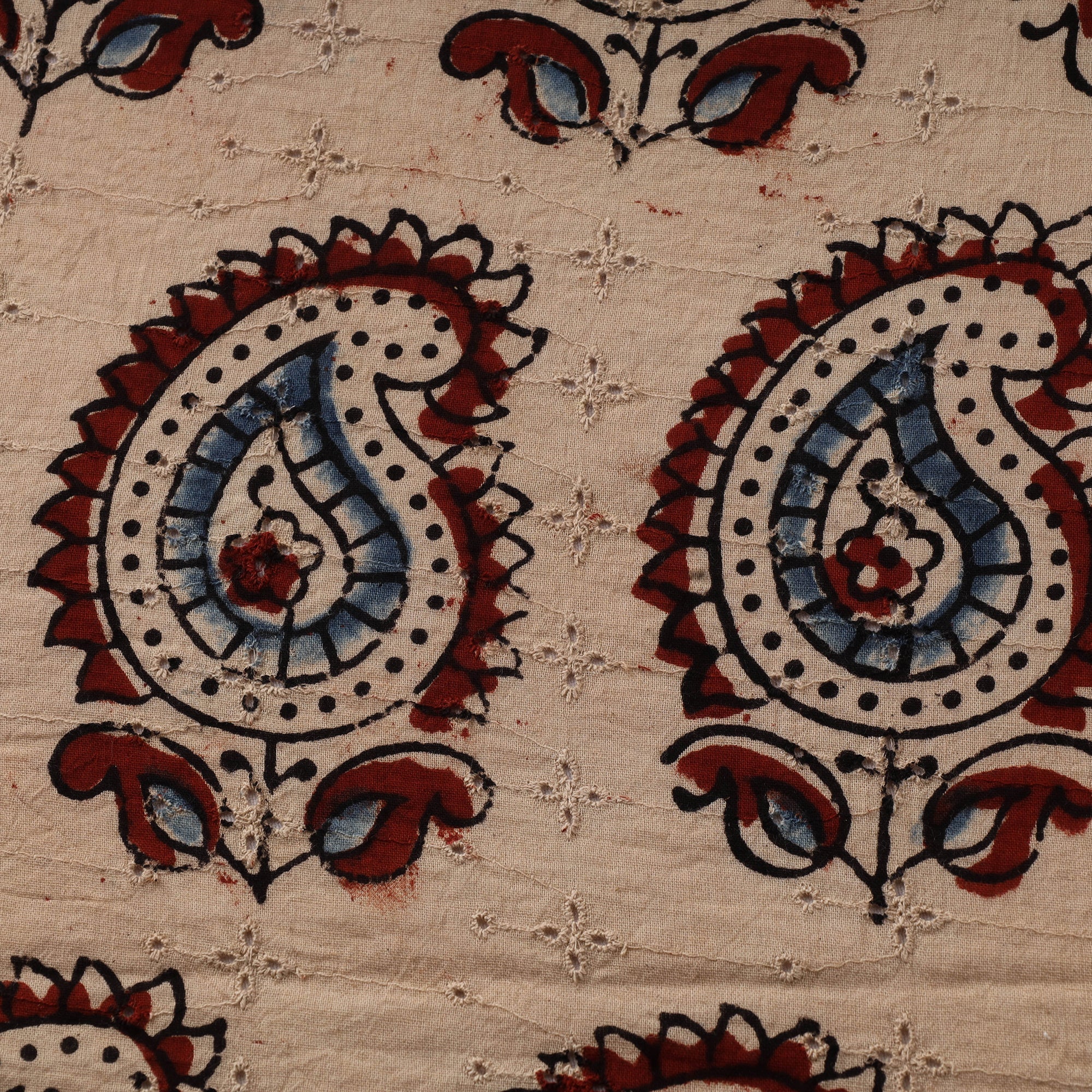 Beige hakoba natural-dyed embroidered cotton ajrakh print fabric from Kutch, Gujarat. Crafted using natural dyes and a 4,500-year-old resist hand-block printing technique, this fabric blends timeless elegance with everyday comfort. Featuring airy cutwork embroidery and delicate eyelet patterns, hakoba is a beloved choice for blouses, kurtis, sarees and dresses. The soft cotton base ensures breathability, making it ideal for all-day wear.