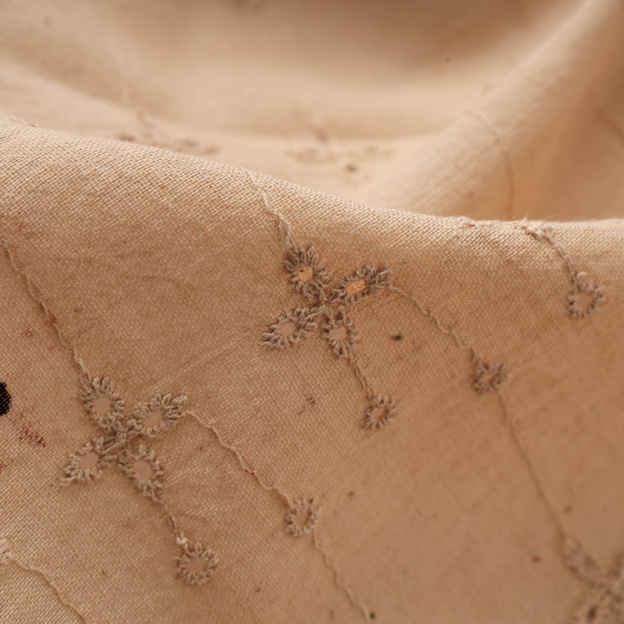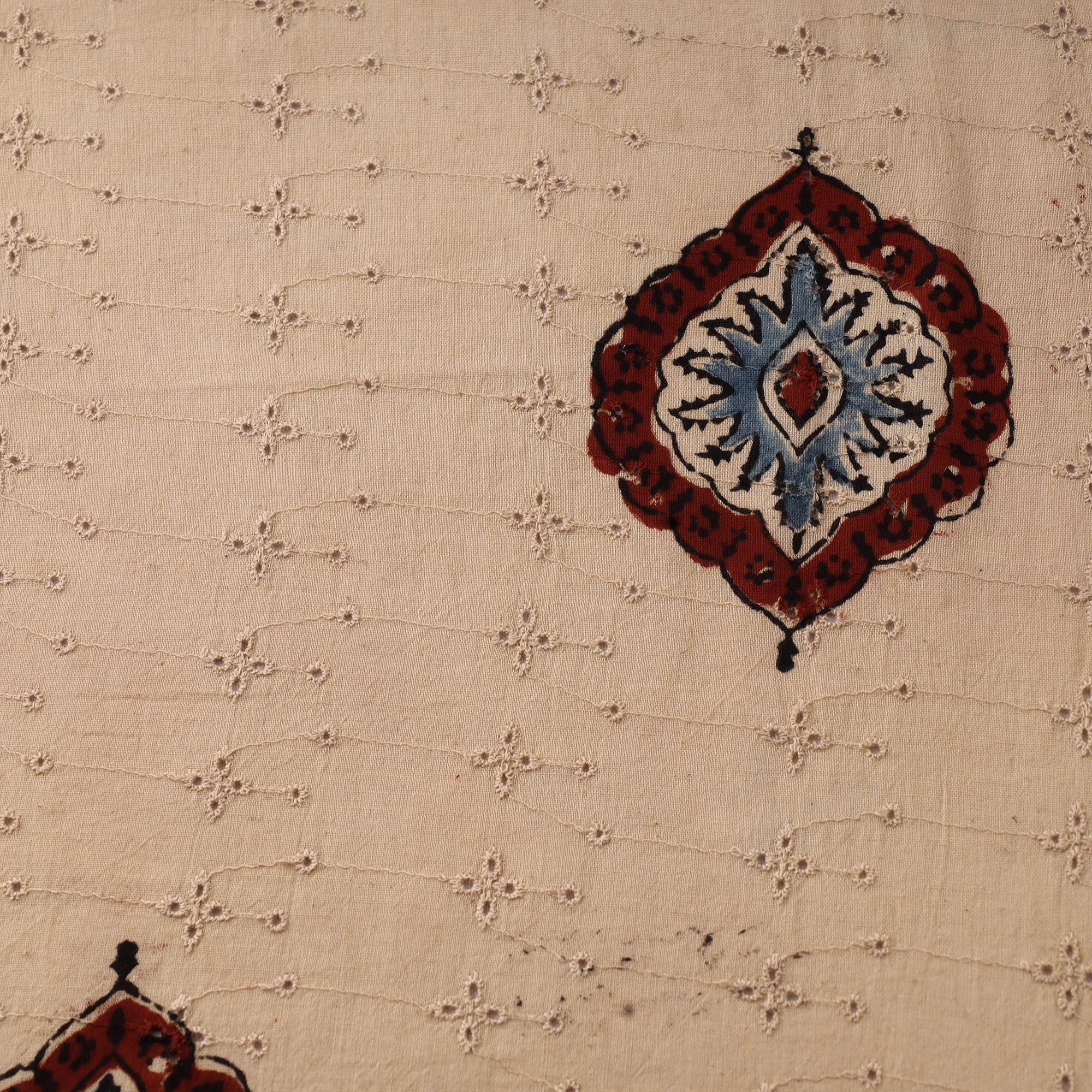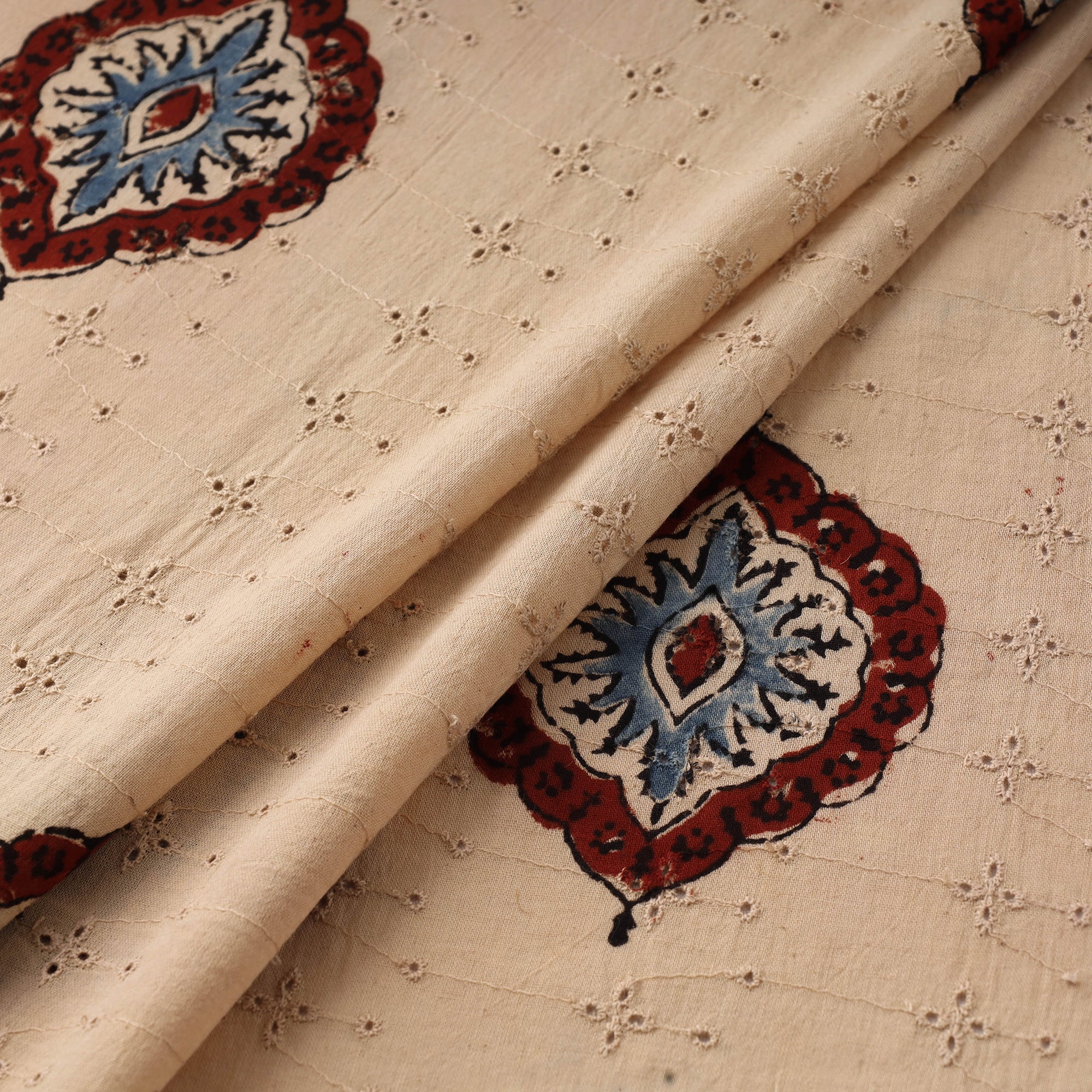 Beige hakoba natural-dyed embroidered cotton ajrakh print fabric from Kutch, Gujarat. Crafted using natural dyes and a 4,500-year-old resist hand-block printing technique, this fabric blends timeless elegance with everyday comfort. Featuring airy cutwork embroidery and delicate eyelet patterns, hakoba is a beloved choice for blouses, kurtis, sarees and dresses. The soft cotton base ensures breathability, making it ideal for all-day wear.