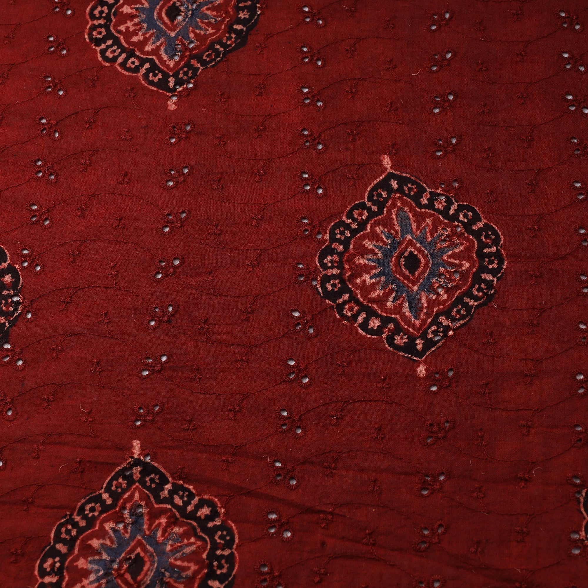 Red hakoba natural-dyed embroidered cotton ajrakh print fabric from Kutch, Gujarat. Crafted using natural dyes and a 4,500-year-old resist hand-block printing technique, this fabric blends timeless elegance with everyday comfort. Featuring airy cutwork embroidery and delicate eyelet patterns, hakoba is a beloved choice for blouses, kurtis, sarees and dresses. The soft cotton base ensures breathability, making it ideal for all-day wear.