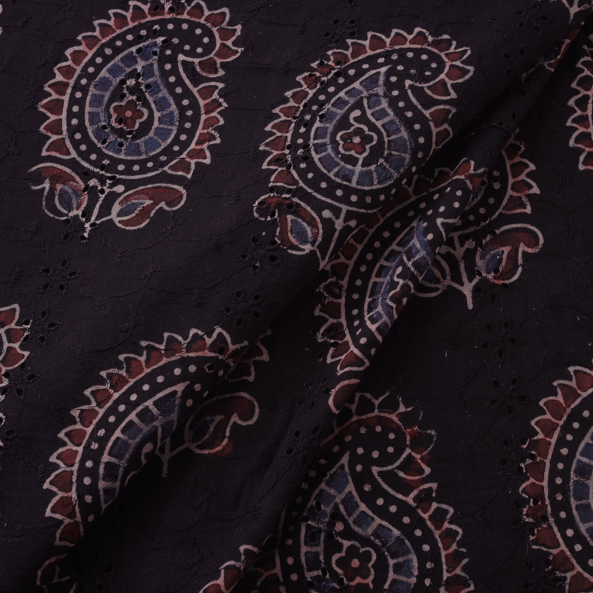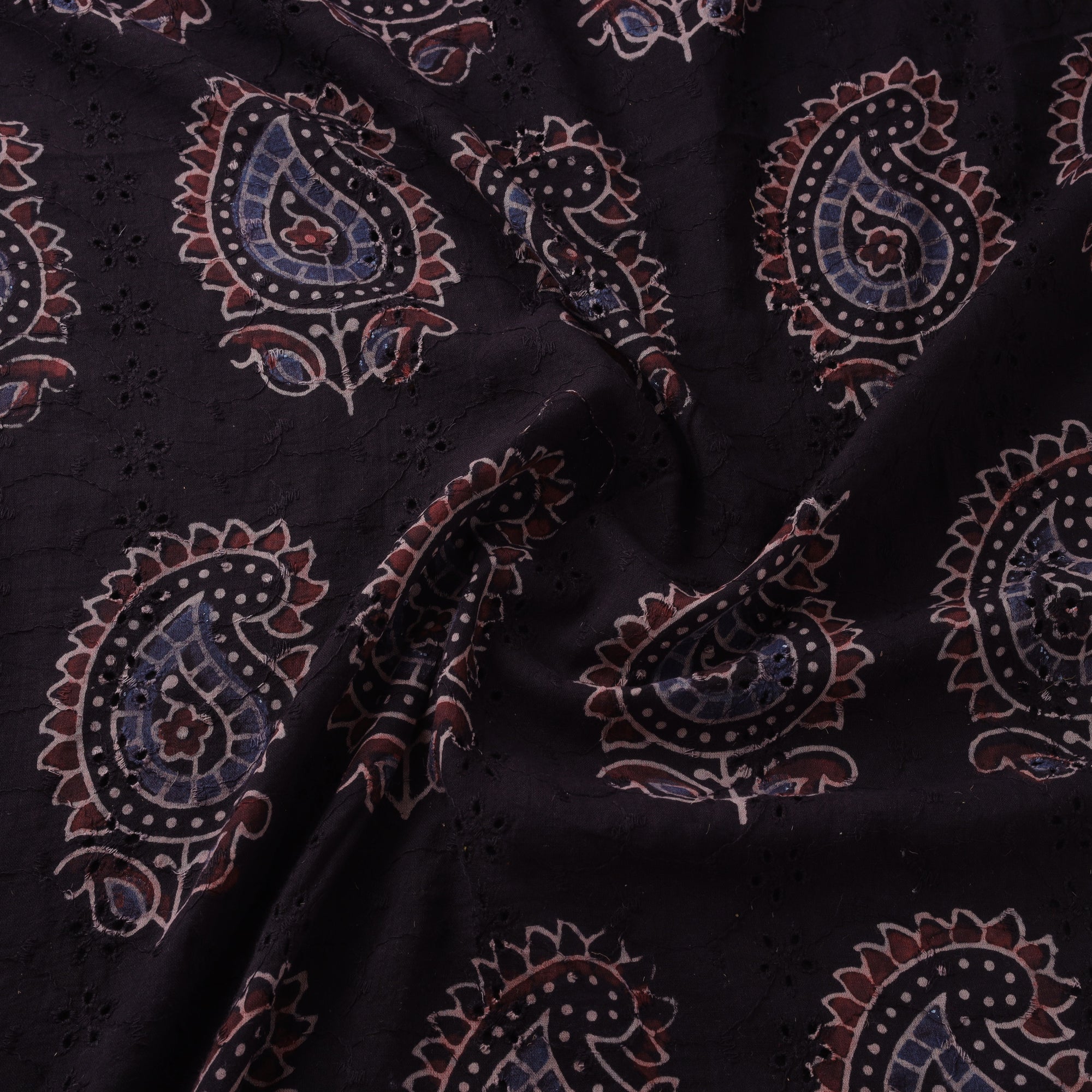 Black hakoba natural-dyed embroidered cotton ajrakh print fabric from Kutch, Gujarat. Crafted using natural dyes and a 4,500-year-old resist hand-block printing technique, this fabric blends timeless elegance with everyday comfort. Featuring airy cutwork embroidery and delicate eyelet patterns, hakoba is a beloved choice for blouses, kurtis, sarees and dresses. The soft cotton base ensures breathability, making it ideal for all-day wear.