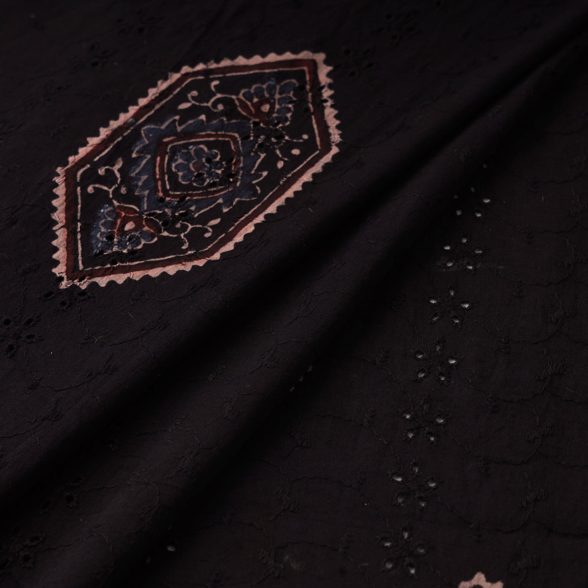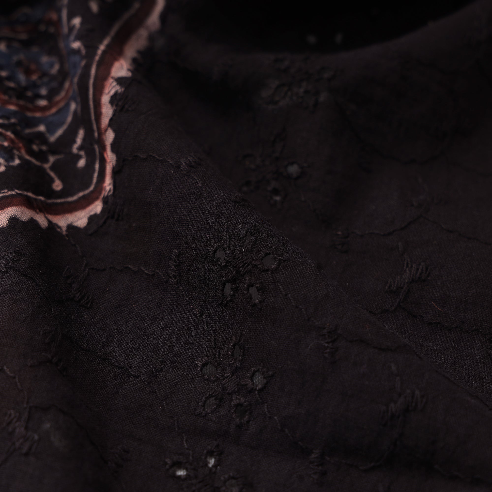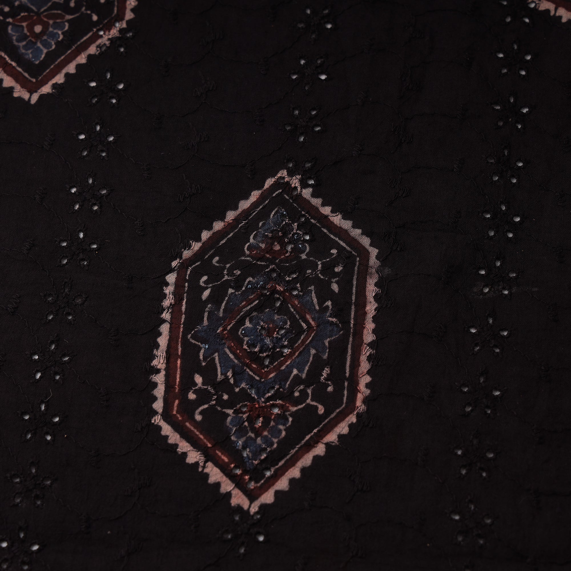 Black hakoba natural-dyed embroidered cotton ajrakh print fabric from Kutch, Gujarat. Crafted using natural dyes and a 4,500-year-old resist hand-block printing technique, this fabric blends timeless elegance with everyday comfort. Featuring airy cutwork embroidery and delicate eyelet patterns, hakoba is a beloved choice for blouses, kurtis, sarees and dresses. The soft cotton base ensures breathability, making it ideal for all-day wear.