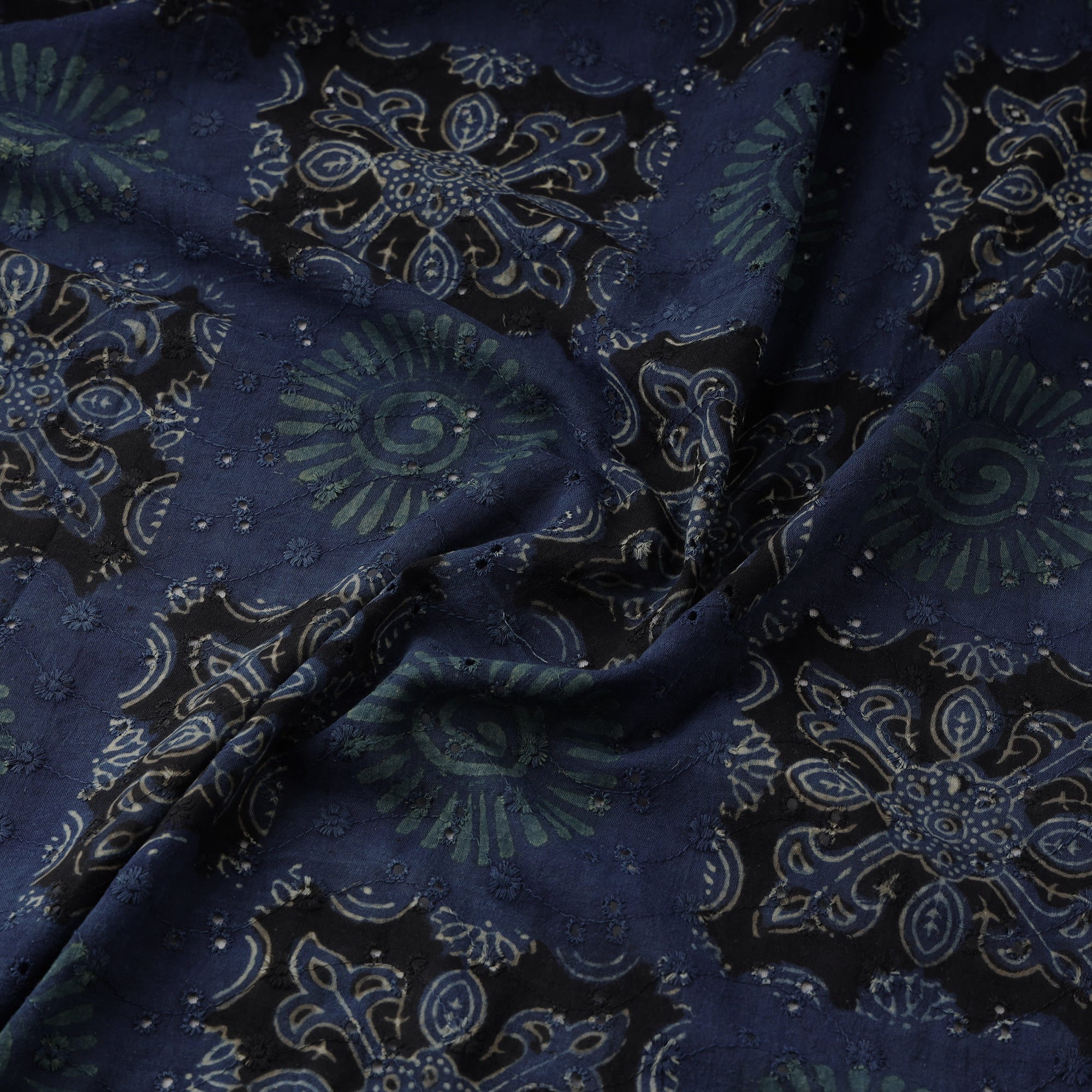 Blue hakoba natural-dyed embroidered cotton ajrakh print fabric from Kutch, Gujarat. Crafted using natural dyes and a 4,500-year-old resist hand-block printing technique, this fabric blends timeless elegance with everyday comfort. Featuring airy cutwork embroidery and delicate eyelet patterns, hakoba is a beloved choice for blouses, kurtis, sarees and dresses. The soft cotton base ensures breathability, making it ideal for all-day wear.