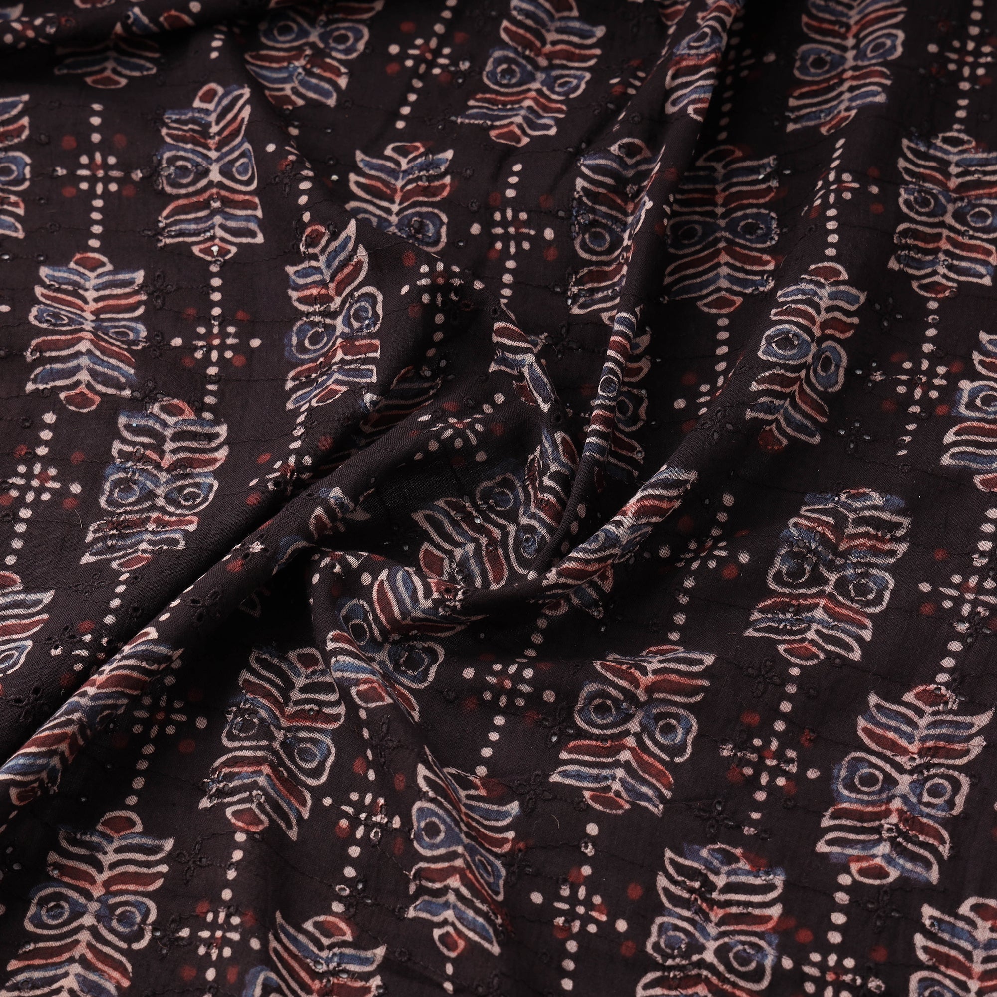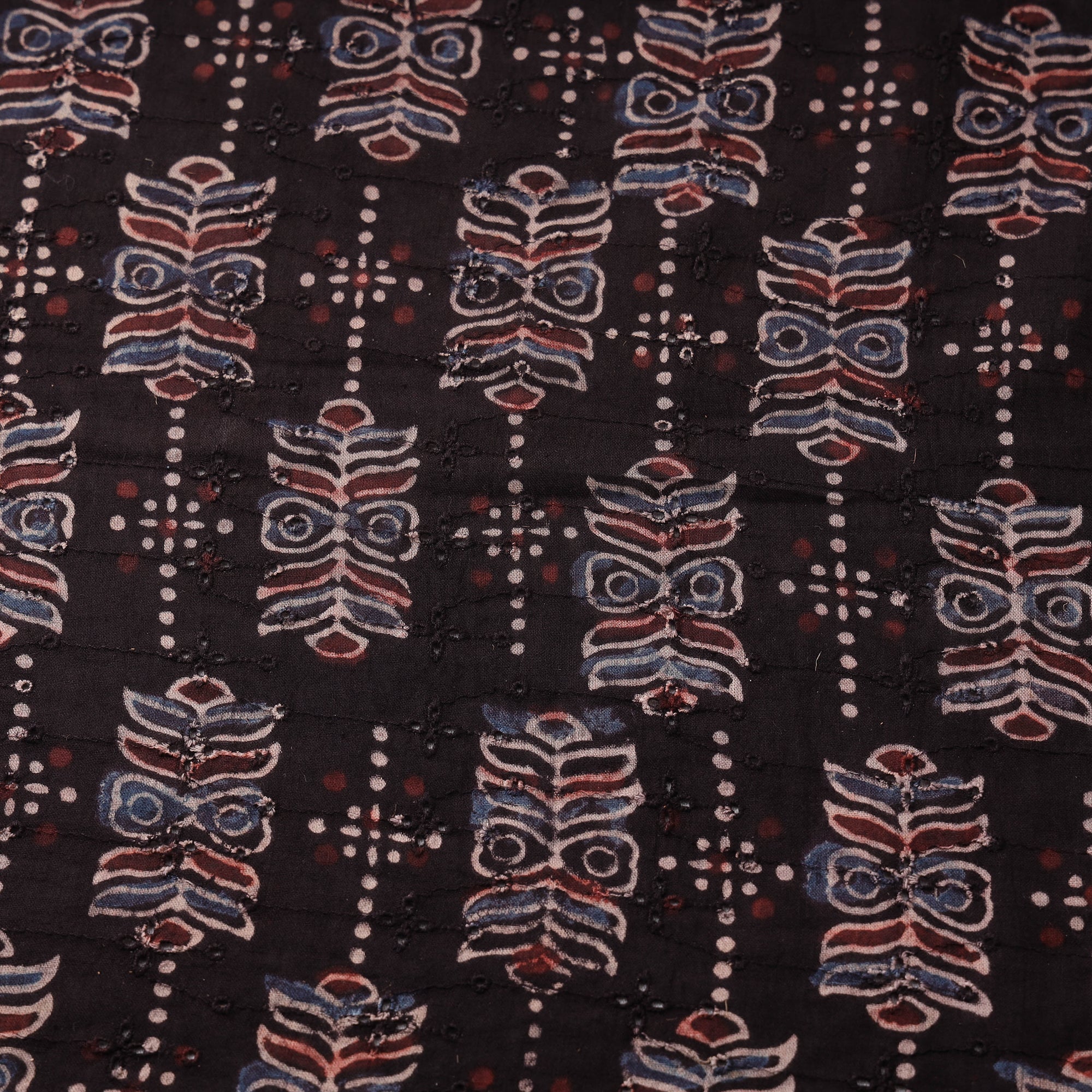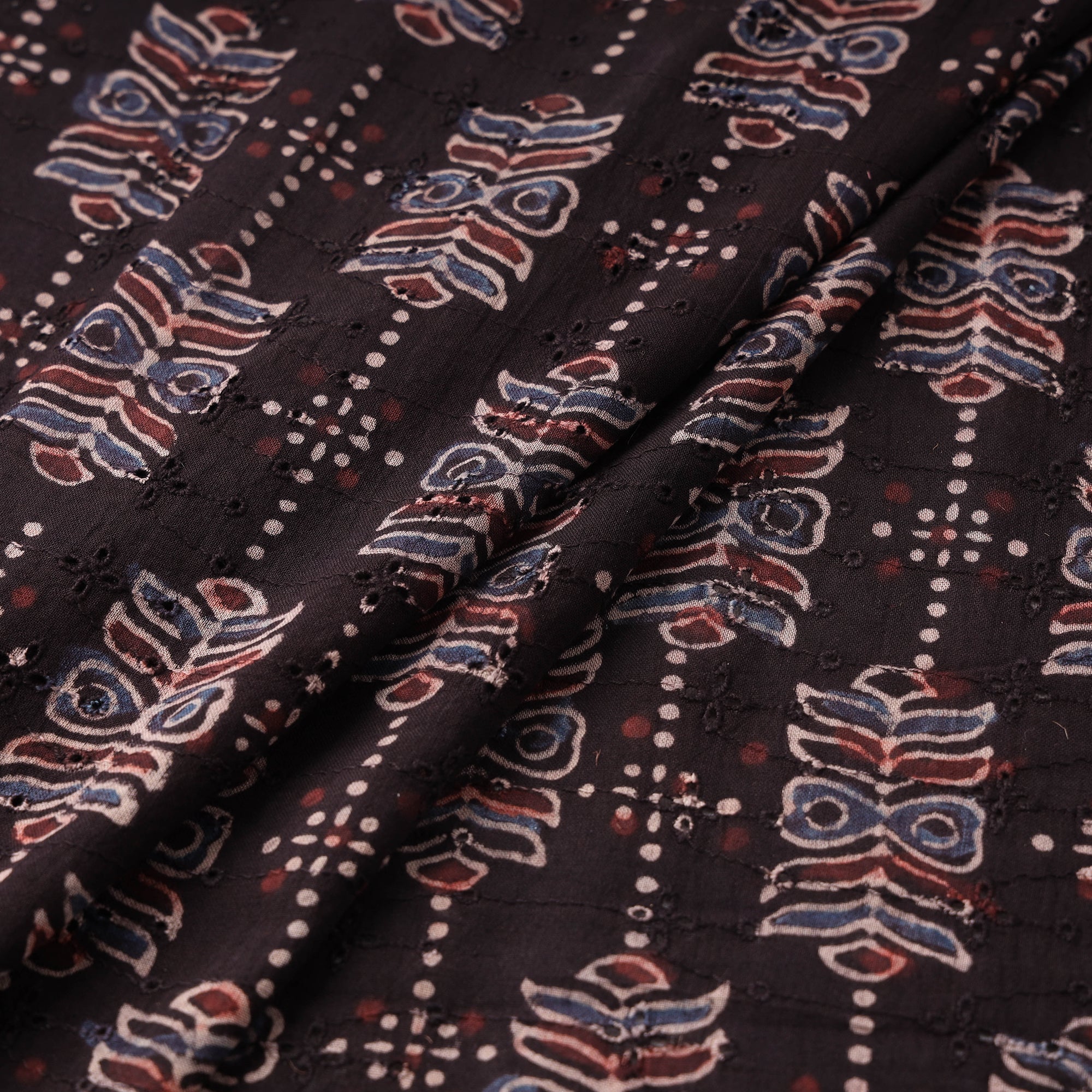 Black hakoba natural-dyed embroidered cotton ajrakh print fabric from Kutch, Gujarat. Crafted using natural dyes and a 4,500-year-old resist hand-block printing technique, this fabric blends timeless elegance with everyday comfort. Featuring airy cutwork embroidery and delicate eyelet patterns, hakoba is a beloved choice for blouses, kurtis, sarees and dresses. The soft cotton base ensures breathability, making it ideal for all-day wear.