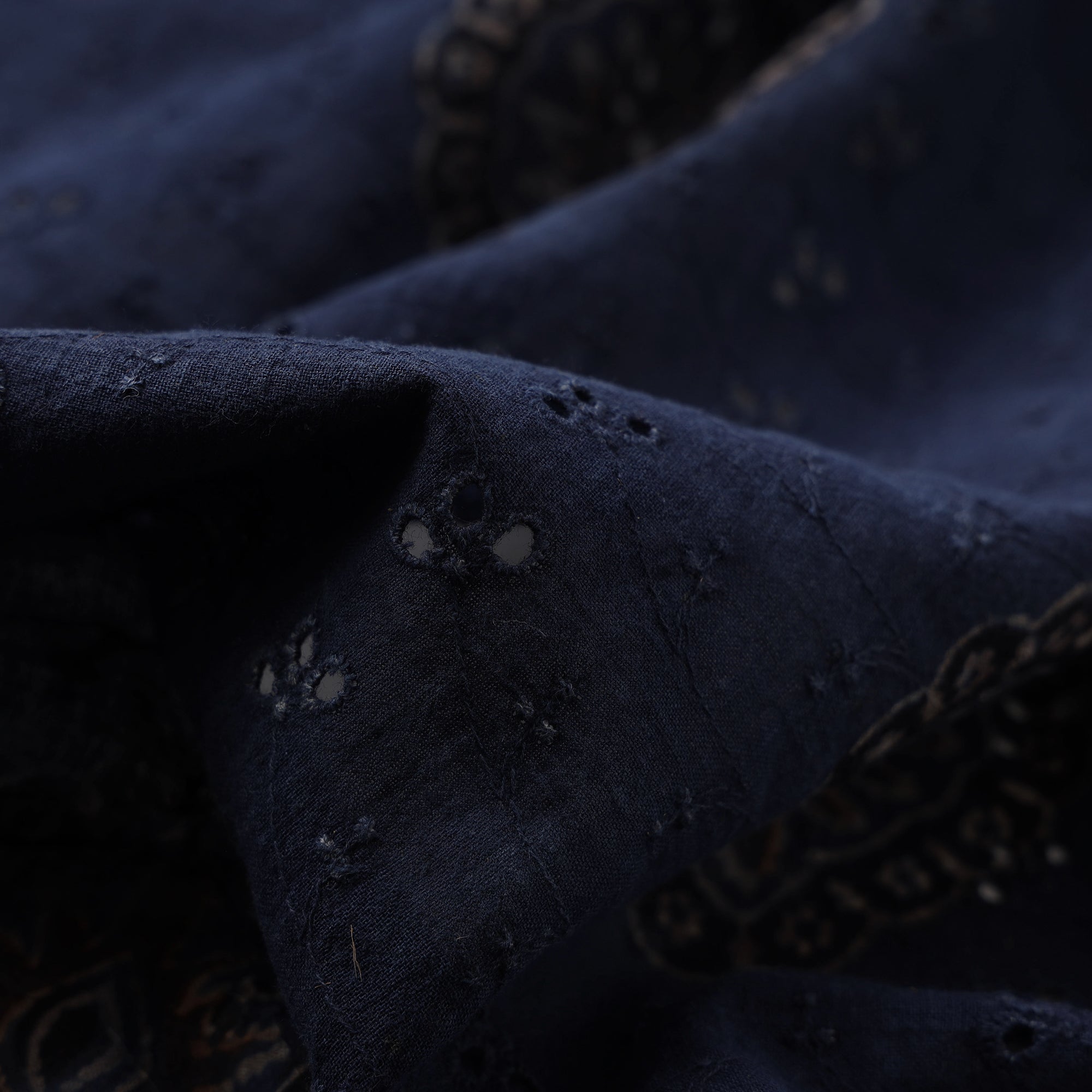 Blue hakoba natural-dyed embroidered cotton ajrakh print fabric from Kutch, Gujarat. Crafted using natural dyes and a 4,500-year-old resist hand-block printing technique, this fabric blends timeless elegance with everyday comfort. Featuring airy cutwork embroidery and delicate eyelet patterns, hakoba is a beloved choice for blouses, kurtis, sarees and dresses. The soft cotton base ensures breathability, making it ideal for all-day wear.