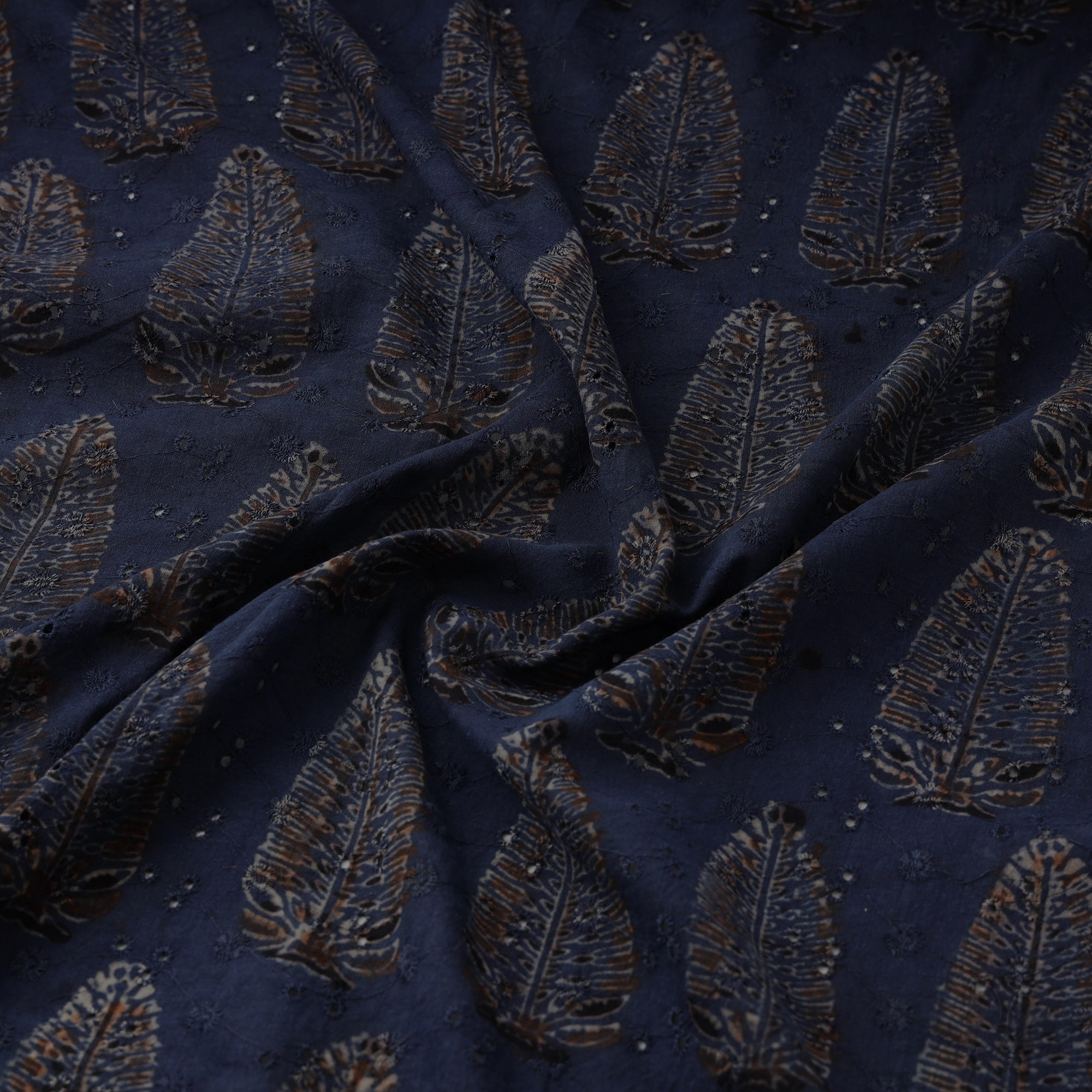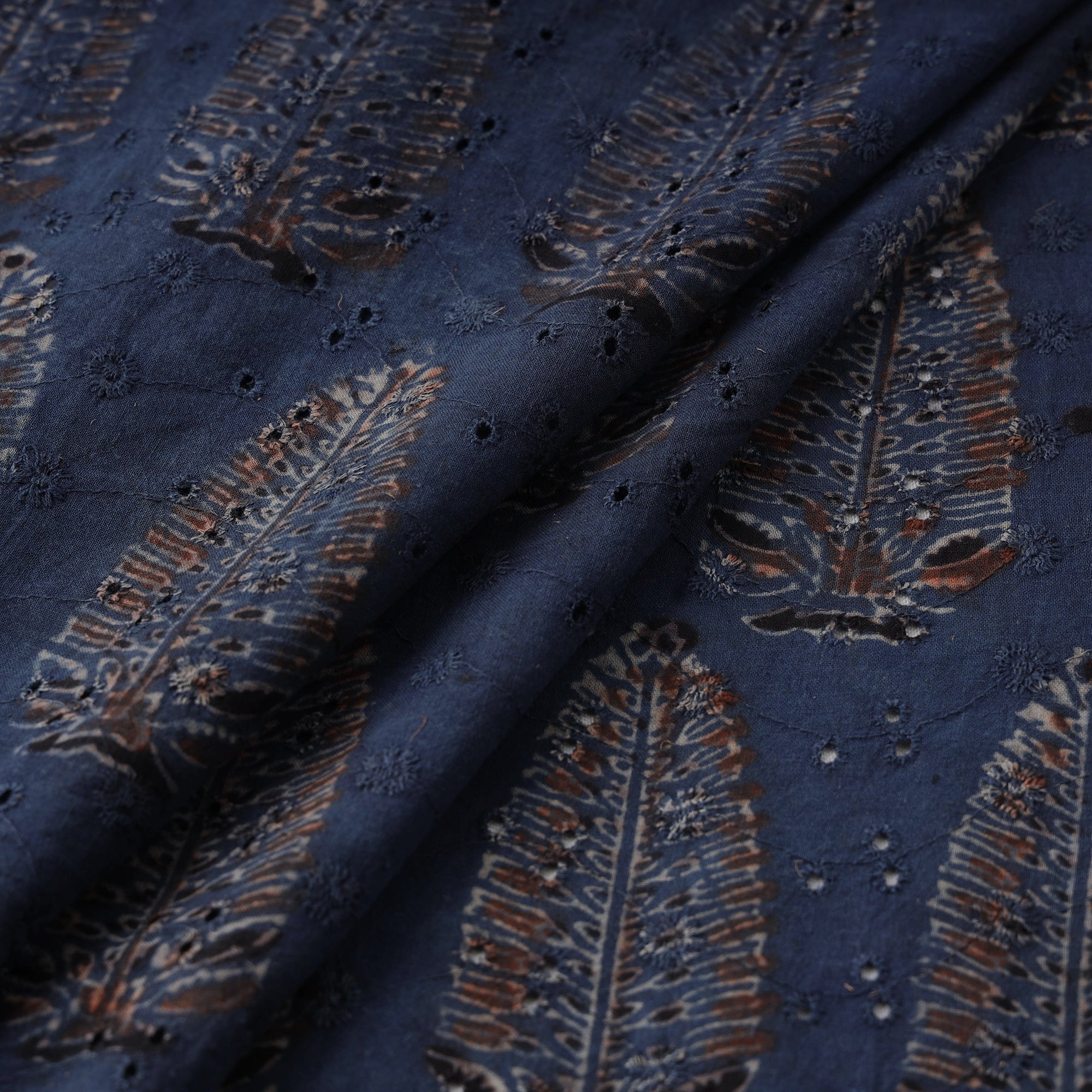 Blue hakoba natural-dyed embroidered cotton ajrakh print fabric from Kutch, Gujarat. Crafted using natural dyes and a 4,500-year-old resist hand-block printing technique, this fabric blends timeless elegance with everyday comfort. Featuring airy cutwork embroidery and delicate eyelet patterns, hakoba is a beloved choice for blouses, kurtis, sarees and dresses. The soft cotton base ensures breathability, making it ideal for all-day wear.