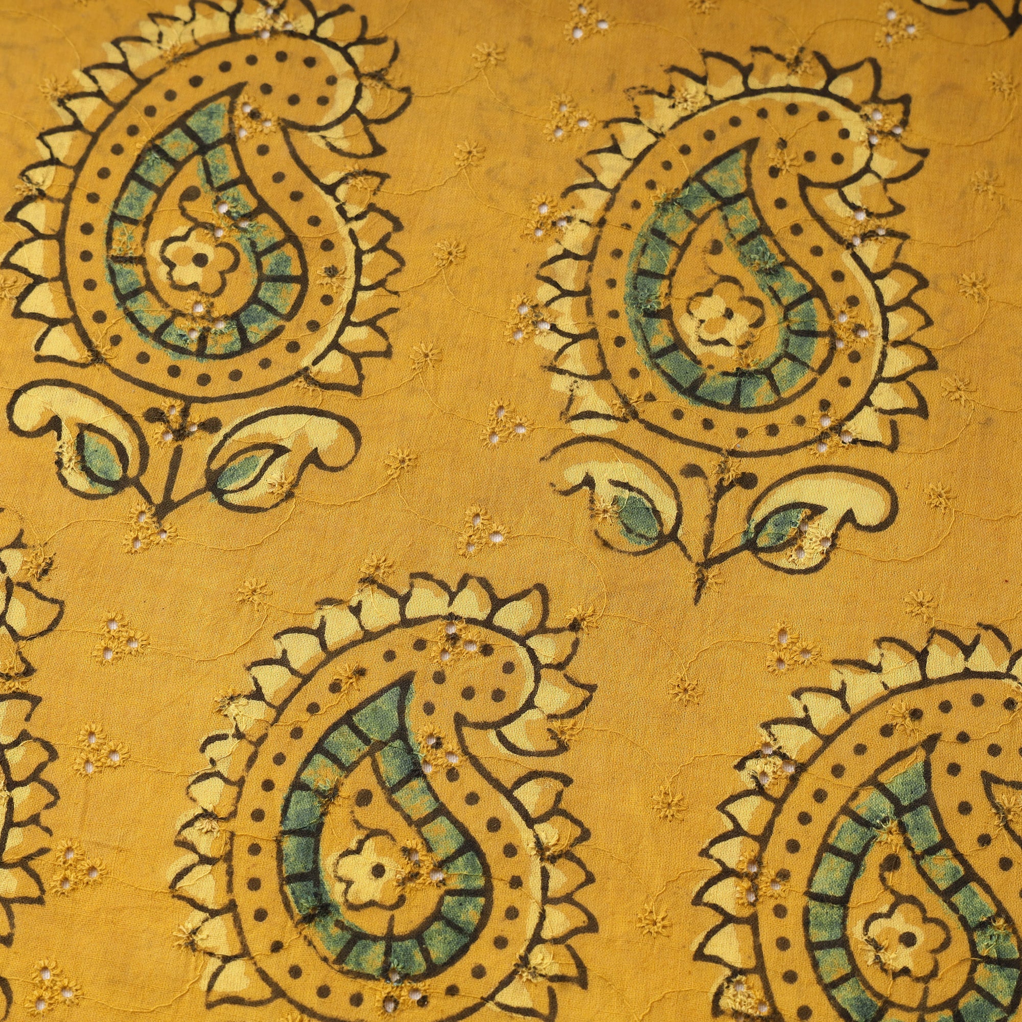 Hakoba natural-dyed embroidered cotton ajrakh print fabric from Kutch, Gujarat. Crafted using natural dyes and a 4,500-year-old resist hand-block printing technique, this fabric blends timeless elegance with everyday comfort. Featuring airy cutwork embroidery and delicate eyelet patterns, hakoba is a beloved choice for blouses, kurtis, sarees and dresses. The soft cotton base ensures breathability, making it ideal for all-day wear.