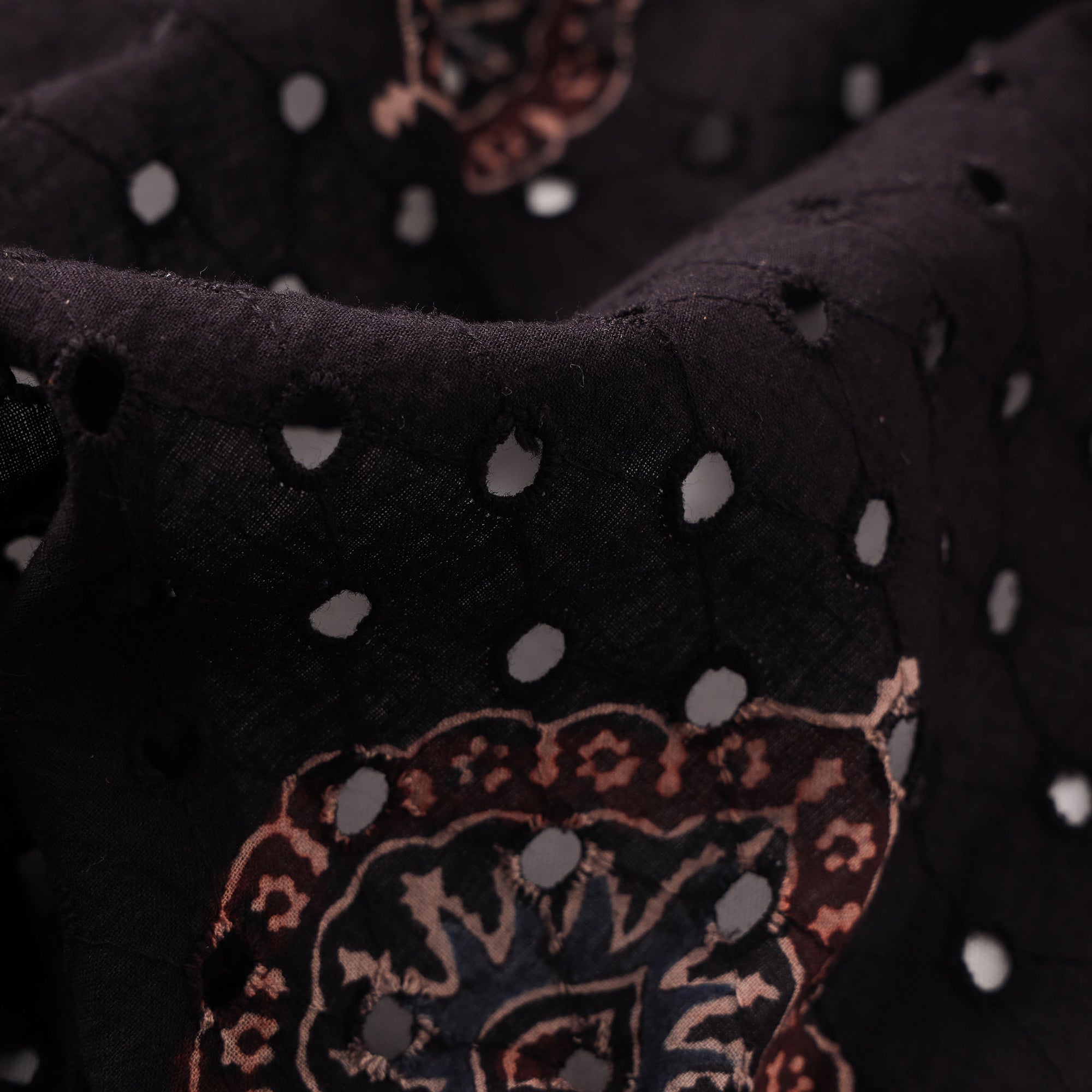 Black hakoba natural-dyed embroidered cotton ajrakh print fabric from Kutch, Gujarat. Crafted using natural dyes and a 4,500-year-old resist hand-block printing technique, this fabric blends timeless elegance with everyday comfort. Featuring airy cutwork embroidery and delicate eyelet patterns, hakoba is a beloved choice for blouses, kurtis, sarees and dresses. The soft cotton base ensures breathability, making it ideal for all-day wear.