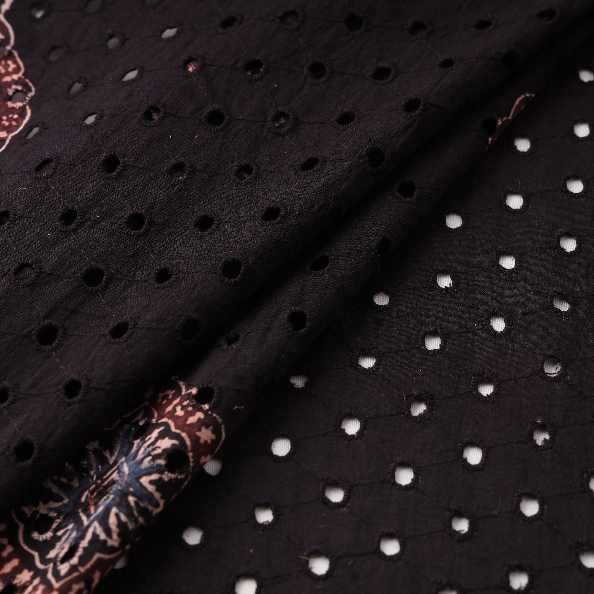 Hakoba natural-dyed embroidered cotton ajrakh print fabric from Kutch, Gujarat. Crafted using natural dyes and a 4,500-year-old resist hand-block printing technique, this fabric blends timeless elegance with everyday comfort. Featuring airy cutwork embroidery and delicate eyelet patterns, hakoba is a beloved choice for blouses, kurtis, sarees and dresses. The soft cotton base ensures breathability, making it ideal for all-day wear.