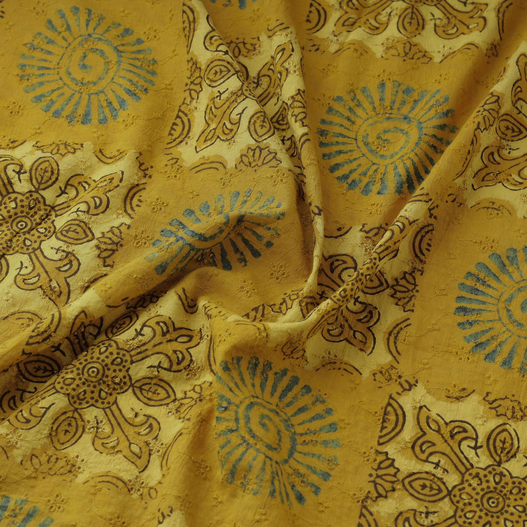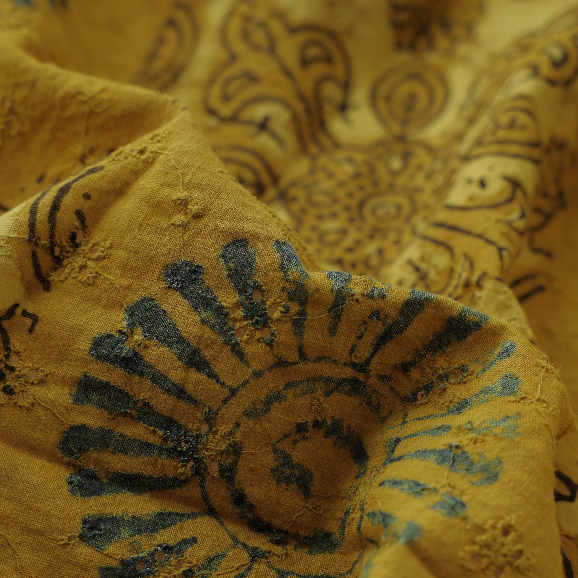 Yellow hakoba natural-dyed embroidered cotton ajrakh print fabric from Kutch, Gujarat. Crafted using natural dyes and a 4,500-year-old resist hand-block printing technique, this fabric blends timeless elegance with everyday comfort. Featuring airy cutwork embroidery and delicate eyelet patterns, hakoba is a beloved choice for blouses, kurtis, sarees and dresses. The soft cotton base ensures breathability, making it ideal for all-day wear.
