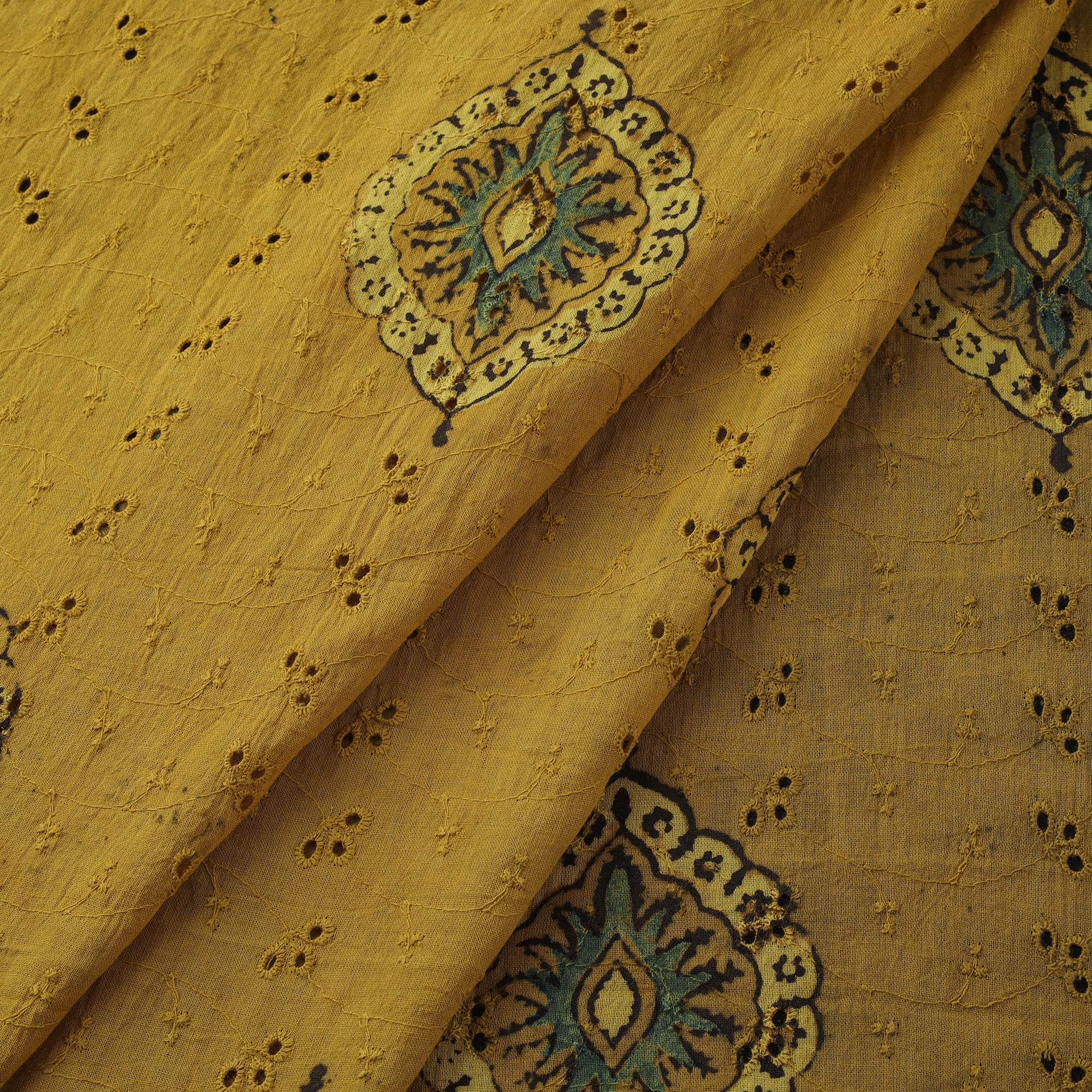 Hakoba cutwork embroidered ajrakh fabric is crafted using natural-dyeing and resist block-printing techniques. This ancient craft is estimated to be around 4,500 years old. The Ajrakh artisans in India originally migrated from Sindh to the Kutch region of Gujarat and to Barmer in Rajasthan. Ajrakh is also the traditional attire of the Maldhari pastoral community of Bhuj. The process is long and detailed, involving multiple stages where each layer of colour is printed only after a resting period, allowing the cloth to absorb the dye fully. Made from cotton, it is ideal for creating kurtas, shirts, dresses or even home decor items.