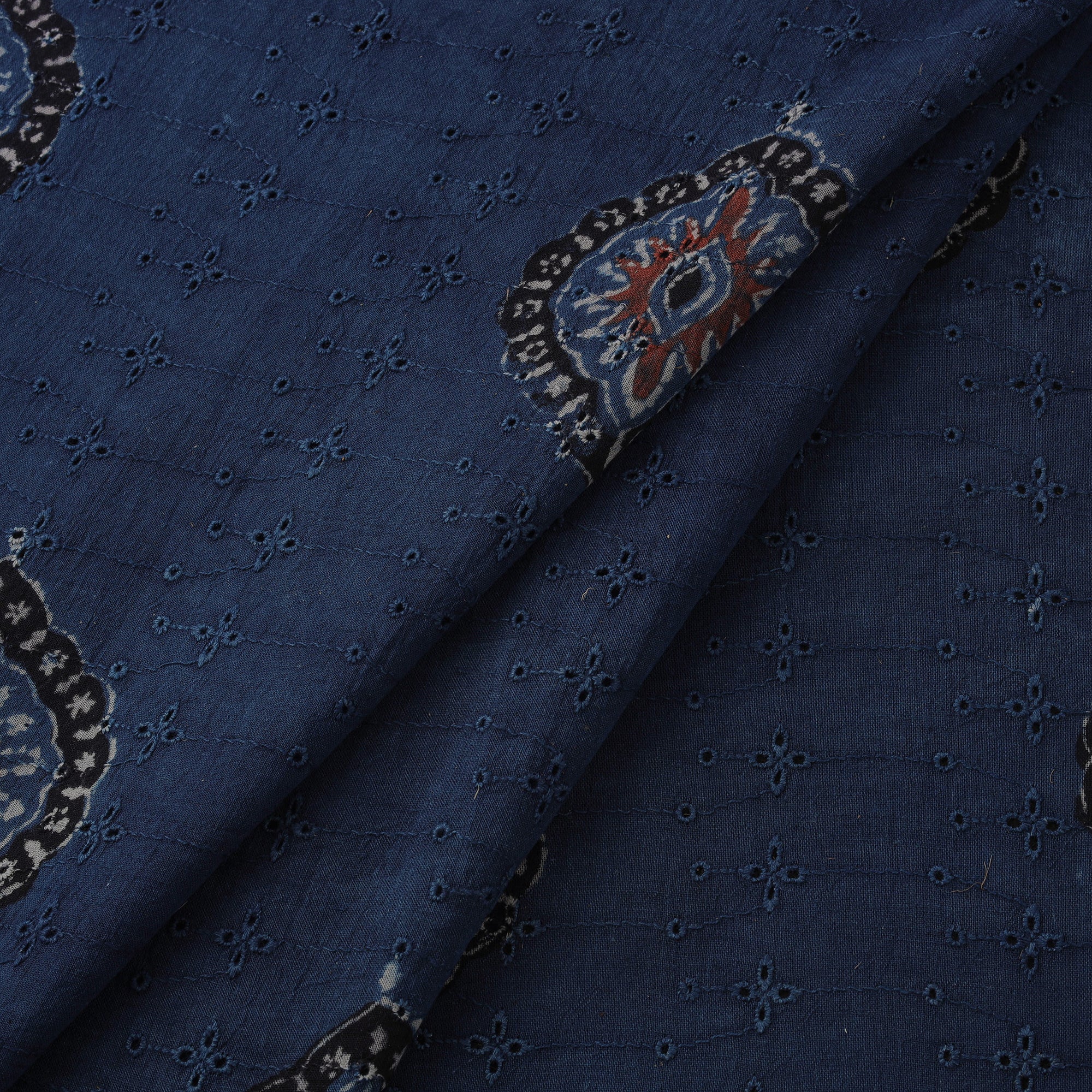 Hakoba cutwork embroidered ajrakh fabric is crafted using natural-dyeing and resist block-printing techniques. This ancient craft is estimated to be around 4,500 years old. The Ajrakh artisans in India originally migrated from Sindh to the Kutch region of Gujarat and to Barmer in Rajasthan. Ajrakh is also the traditional attire of the Maldhari pastoral community of Bhuj. The process is long and detailed, involving multiple stages where each layer of colour is printed only after a resting period, allowing the cloth to absorb the dye fully. Made from cotton, it is ideal for creating kurtas, shirts, dresses or even home decor items.
