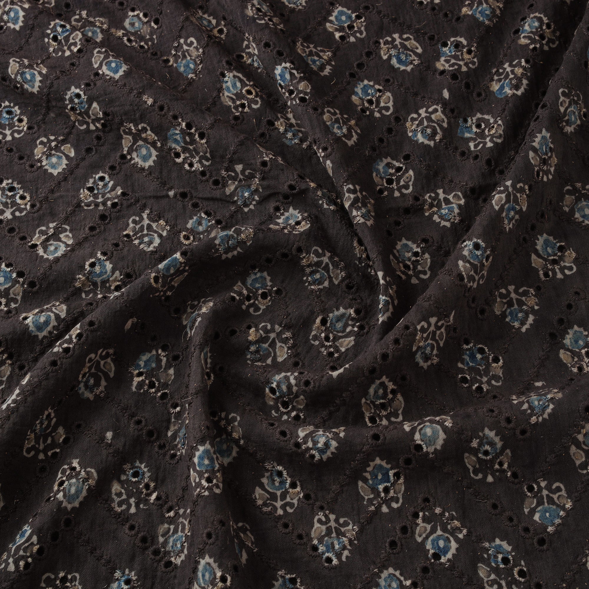 Hakoba cutwork embroidered ajrakh fabric is crafted using natural-dyeing and resist block-printing techniques. This ancient craft is estimated to be around 4,500 years old. The Ajrakh artisans in India originally migrated from Sindh to the Kutch region of Gujarat and to Barmer in Rajasthan. Ajrakh is also the traditional attire of the Maldhari pastoral community of Bhuj. The process is long and detailed, involving multiple stages where each layer of colour is printed only after a resting period, allowing the cloth to absorb the dye fully. Made from cotton, it is ideal for creating kurtas, shirts, dresses or even home decor items.