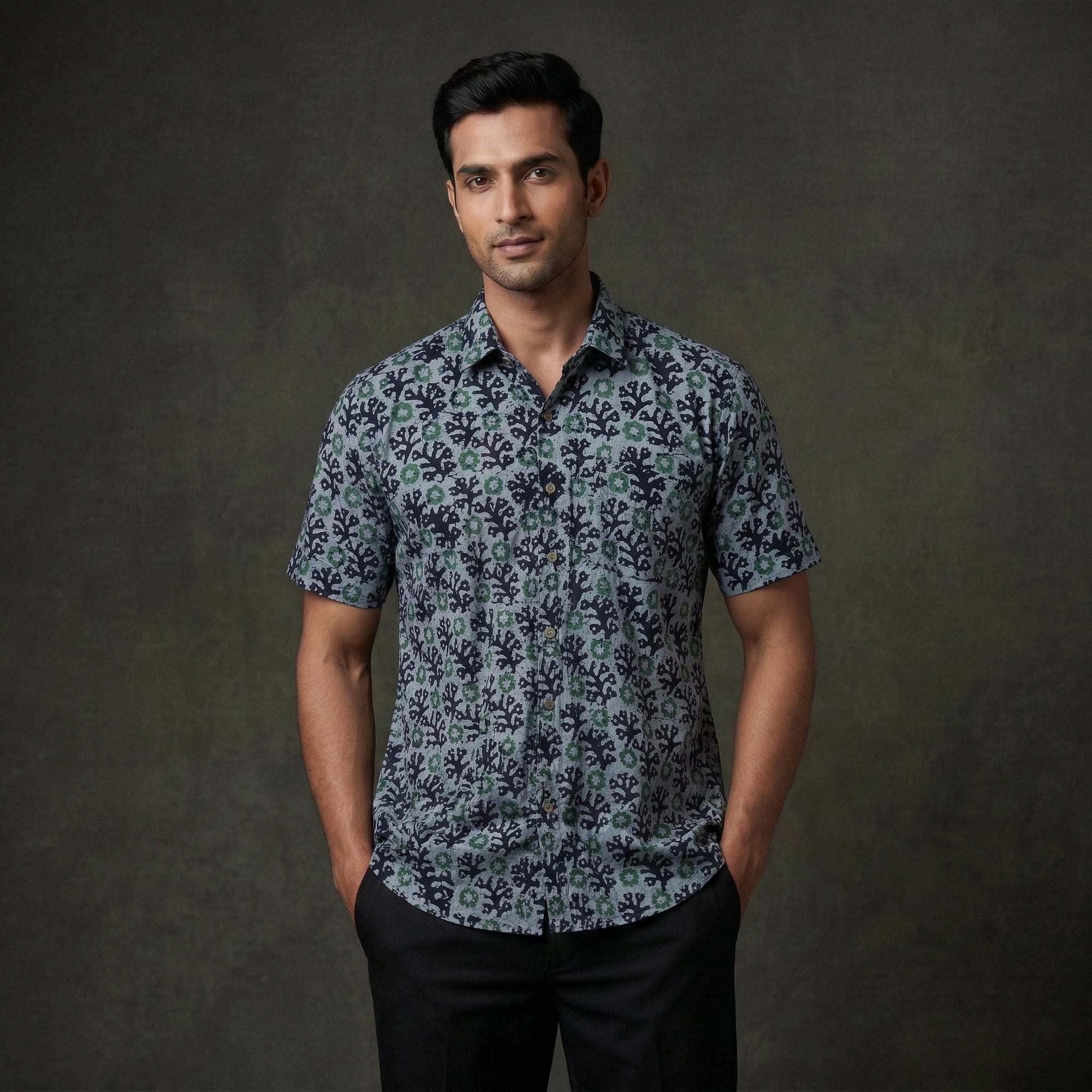 Hand block batik print pure cotton shirt is crafted using the traditional wax-resist dyeing technique, believed to be over 2,000 years old. The shirt features a regular collar and half sleeves, while wooden buttons add a natural touch. A patch pocket on the front offers added convenience. It is suitable for daily outings, casual meet-ups and travel.