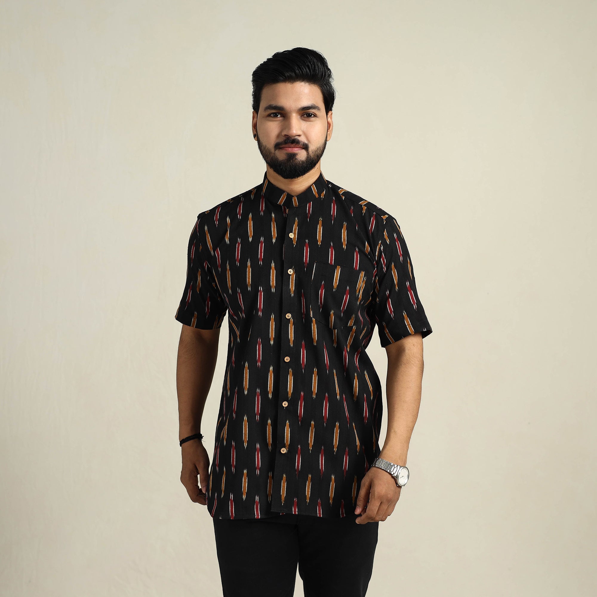 Half-sleeve men cotton black pochampally ikat shirt. This shirt showcases the intricate Ikat dyeing technique, resulting in unique, vibrant patterns. Made from cotton, it ensures all-day comfort. The addition of crisp wooden buttons, half sleeves, with a patch pocket. Elevate your look with the artistry of Ikat