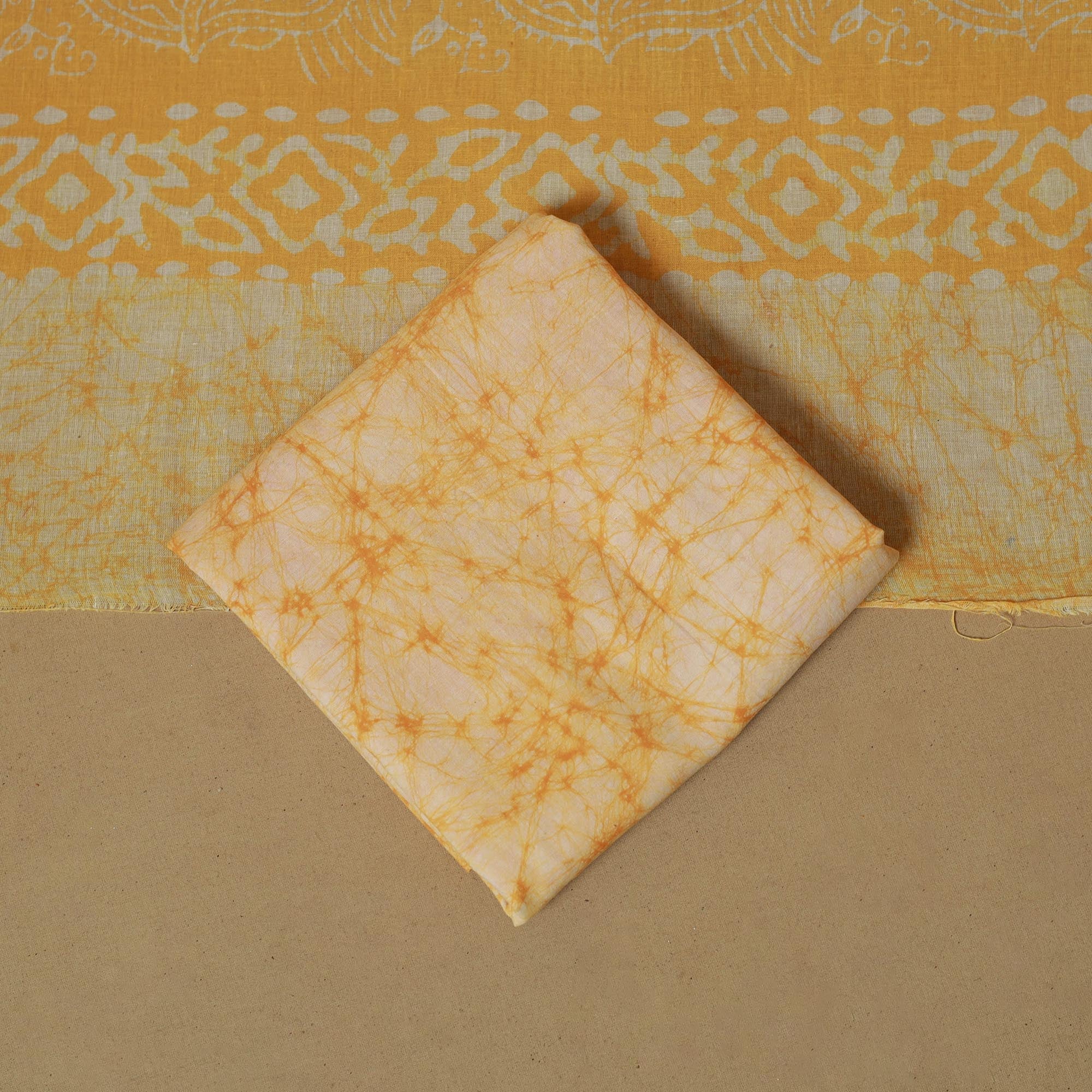 Hand block batik print cotton 3pc unstitched dress material from Madhya Pradesh is crafted artisan by Mohd. Wasim, using the traditional wax-resist dyeing method, known for its bold patterns. The set includes kurta fabric, a coordinated bottom fabric, and a dupatta. The motifs reflect regional artistry passed down through generations, making it a comfortable and stylish choice for occasions or graceful everyday wear.