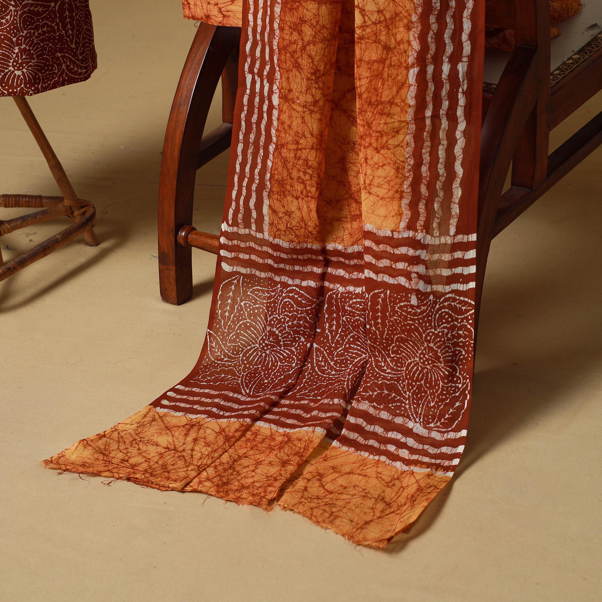 Batik is a very famous technique of wax-resist dyeing applied to whole cloth. The traditional designs and motifs in Indian batik are exceptional. It is a type of resist printing process wherein wax is applied to the fabric in specific areas.